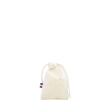 Pochon Valentin S, dimensions 10x15cm, Confection France (atelier BF ou ESS), en 100% coton - tissé France, avec 2 cordons de 3,5mm d'épaisseur. Étiquette intérieure de composition avec logo Bonjour François, galon BBR sur le coté du pochon. 500 pièces par carton. Toile 150g/m².