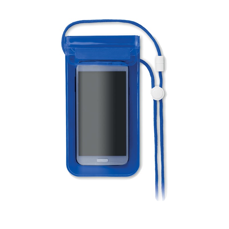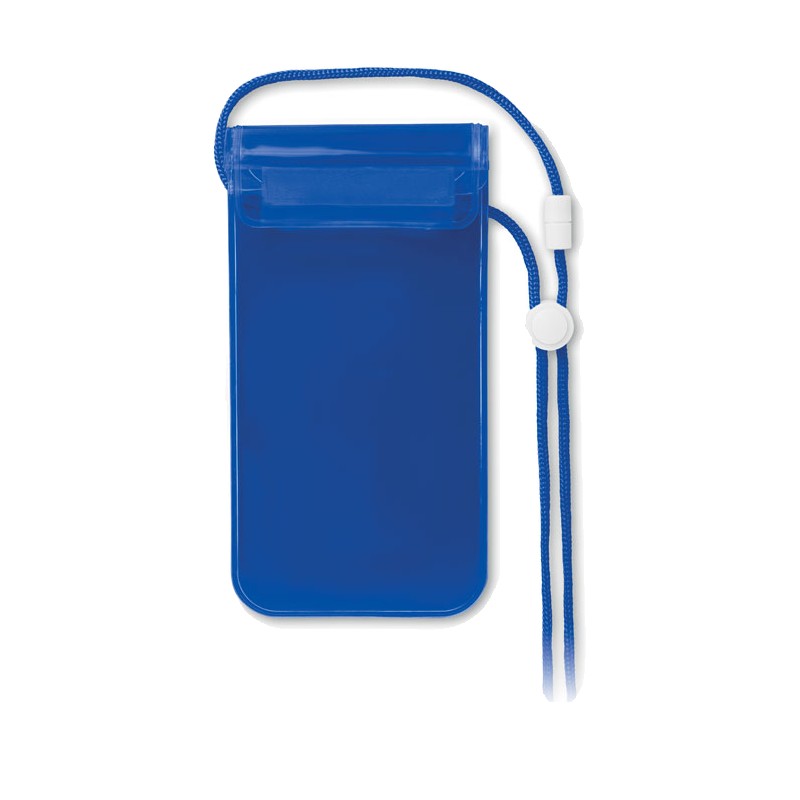 Pochette étanche pour smartphone en PVC avec cordon en polyester. Bouton et fermeture de sécurité . La pochette a une surface qui permet le fonctionnement de l'écran tactile de l'extérieur.