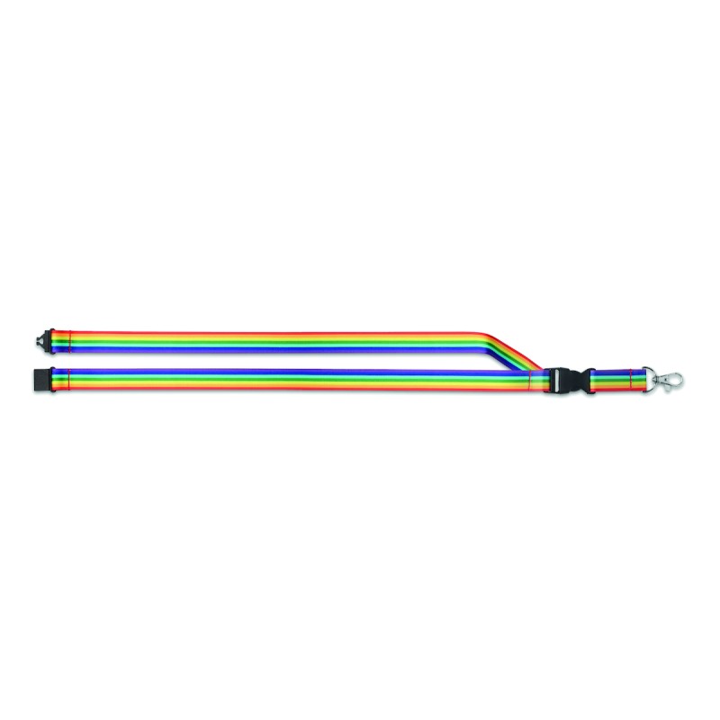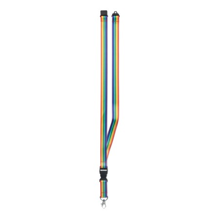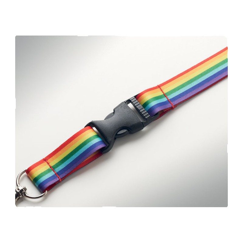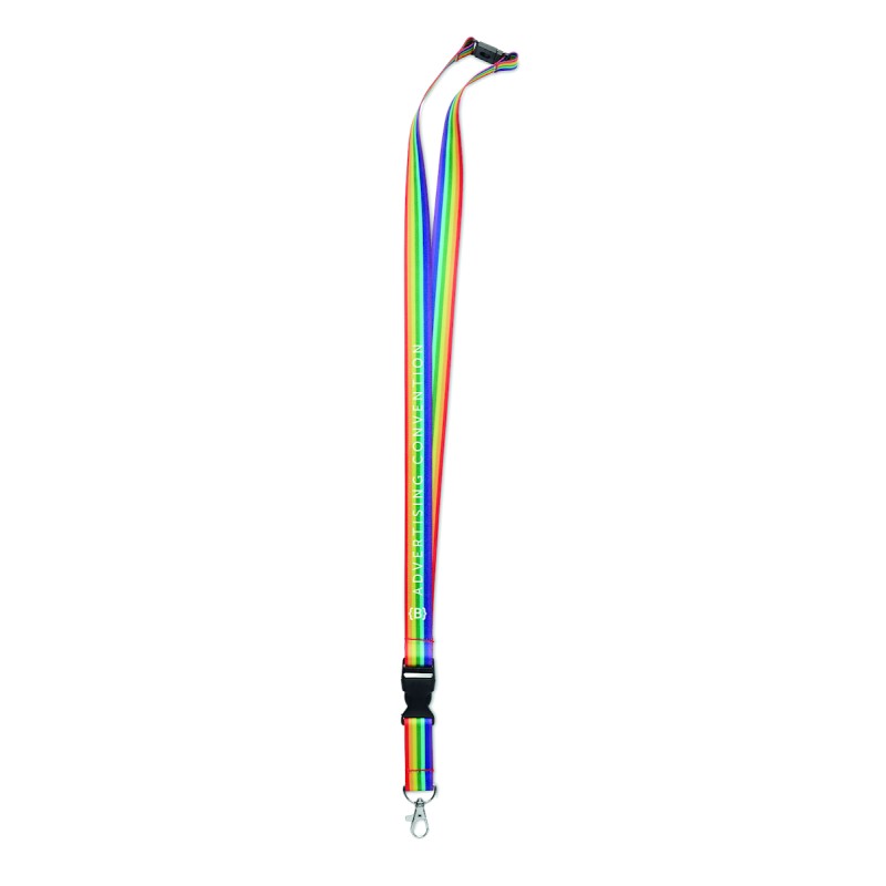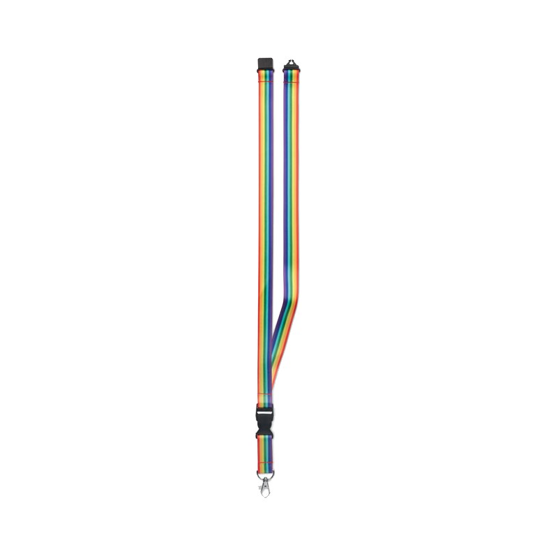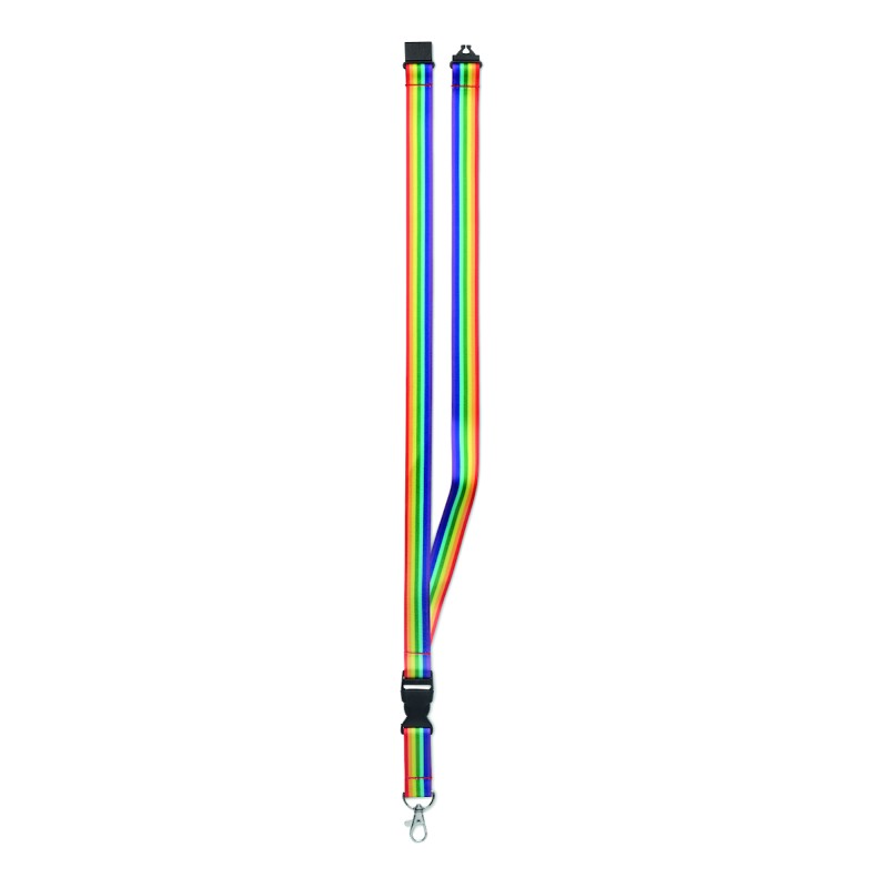Lanyard en RPET arc-en-ciel avec crochet en métal, boucle détachable et fermeture de sécurité.