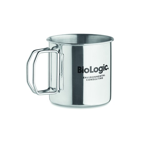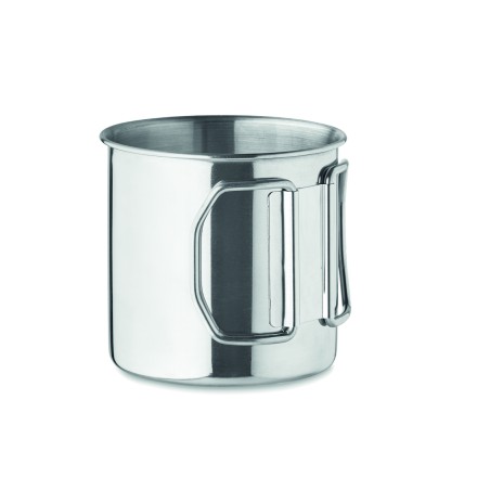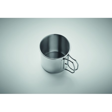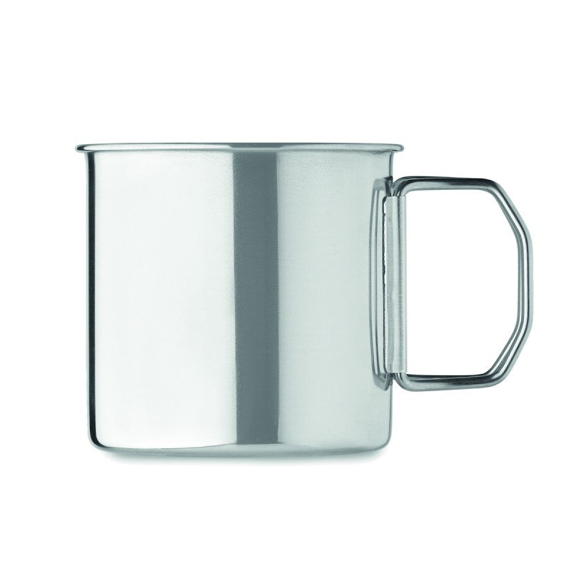 Mug en acier inoxydable à simple paroi avec poignée pliable. Capacité : 330 ml.