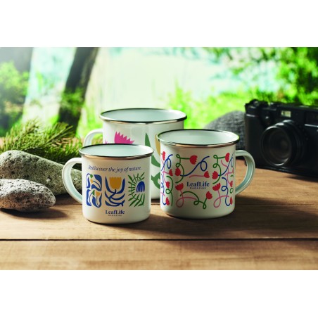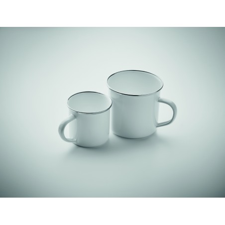 Mug vintage en métal avec couche d'émail idéal pour la sublimation. Capacité de 200 ml.