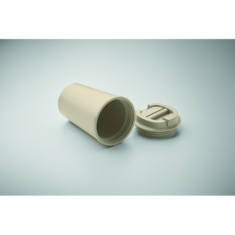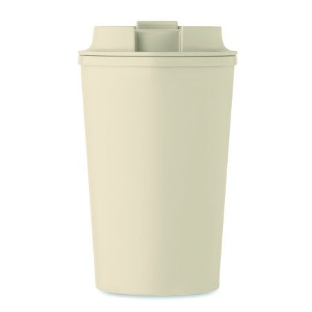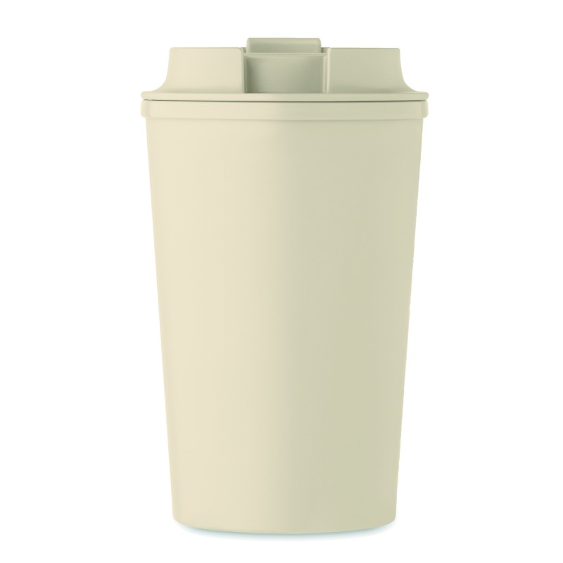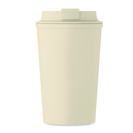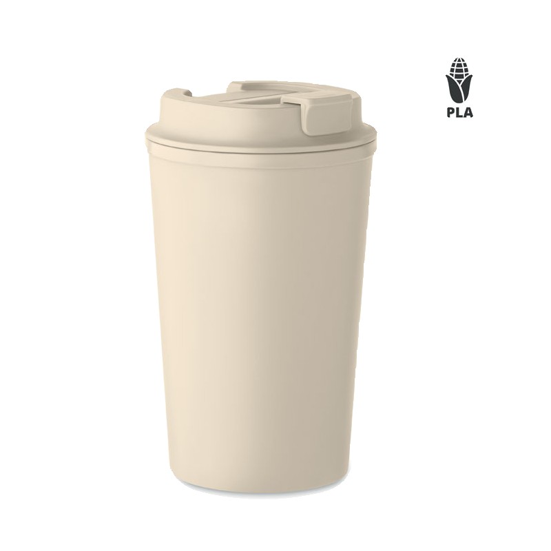 Gobelet double paroi en maïs 100% PLA avec couvercle en PP et intérieur en TPR. Anti fuite. Capacité : 350 ml.