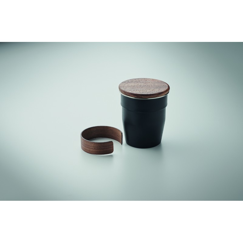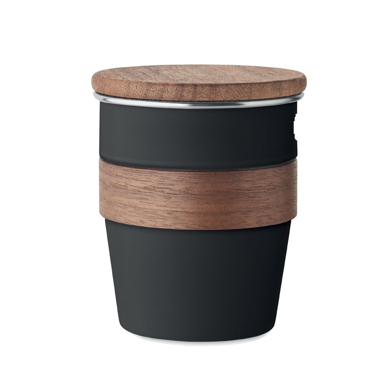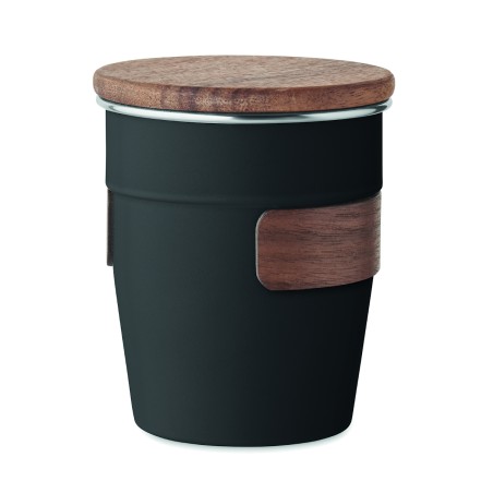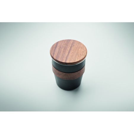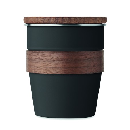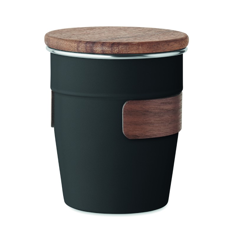 Gobelet à simple paroi en acier inoxydable recyclé (90 % d'acier inox recyclé et 10 % d'acier inox) avec poignée et couvercle en noyer. Capacité : 350 ml. Retirer la poignée pour le nettoyage. Comme il s'agit de simple paroi, il peut y avoir transfert de chaleur.