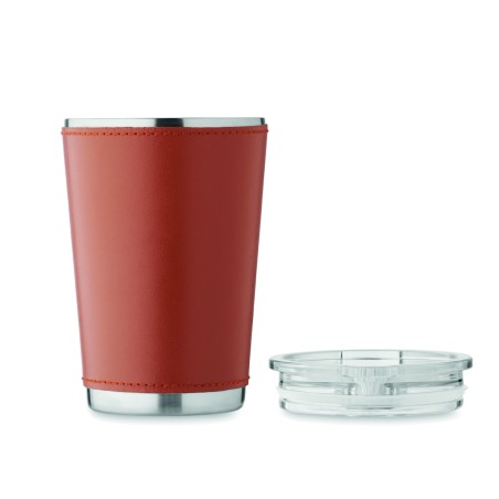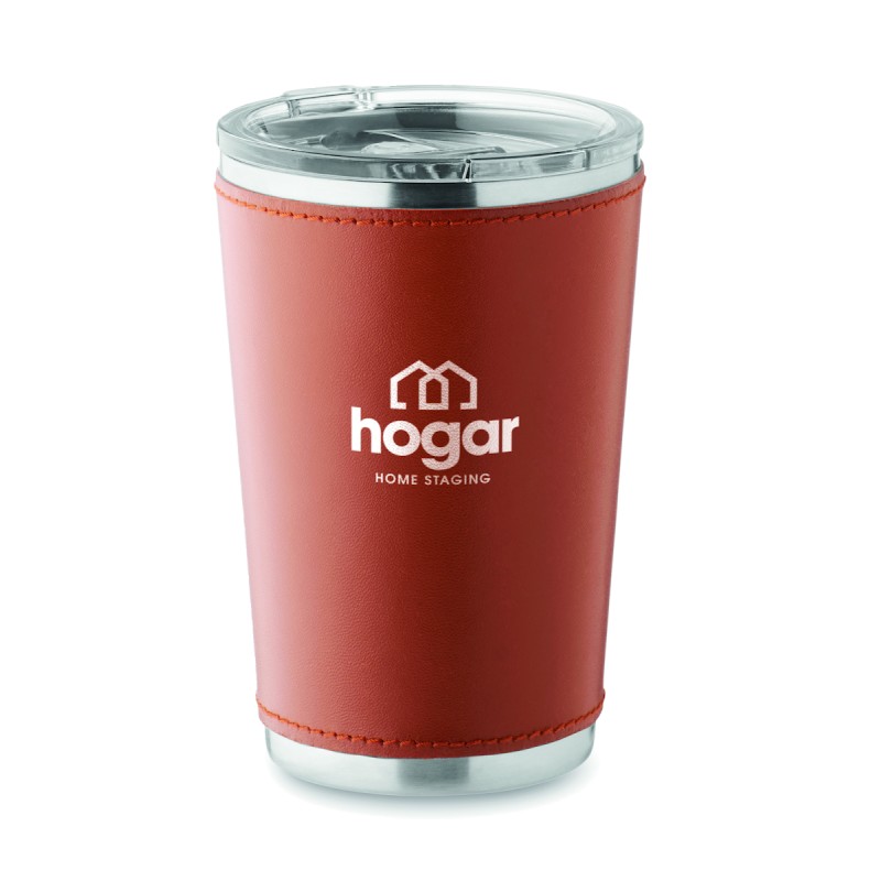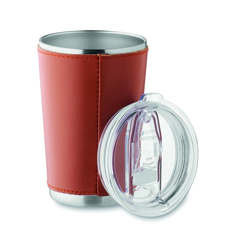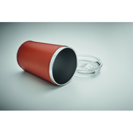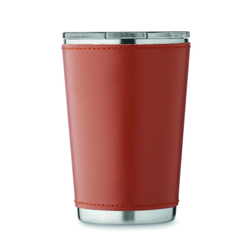 Gobelet à double paroi en acier inoxydable recyclé (90 % d'acier inoxydable recyclé et 10 % d'acier inoxydable) avec manchon amovible en cuir PU. Couvercle avec ouverture coulissante. Anti fuite. Capacité : 350 ml.