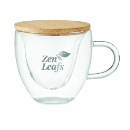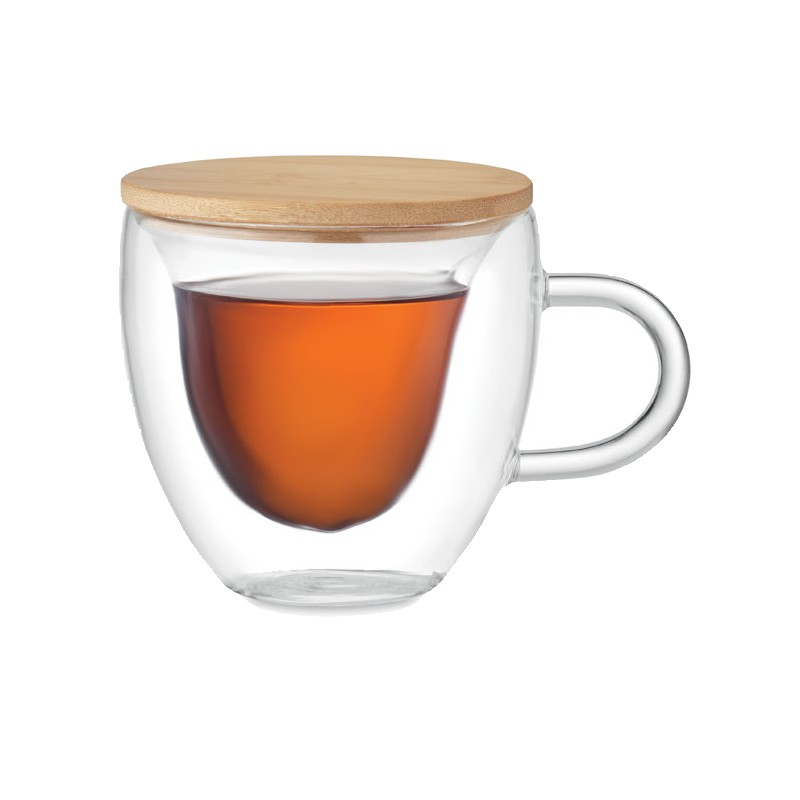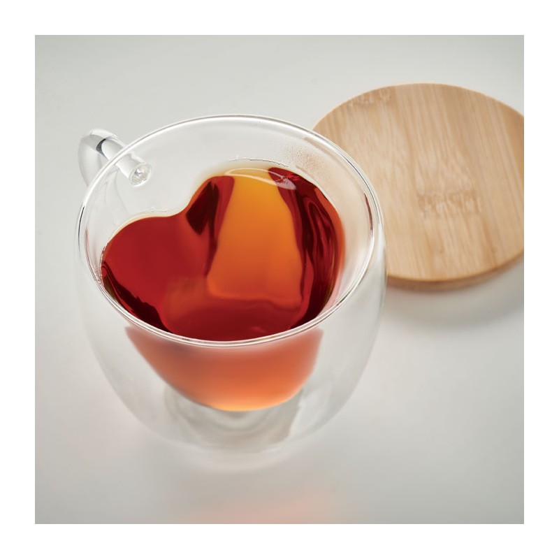 Tasse en verre borosilicate à double paroi en forme de cœur et couvercle en bambou. Capacité : 180 ml. Le bambou est un produit naturel, et présente de légères variations de couleur, de décoration et de tailles.