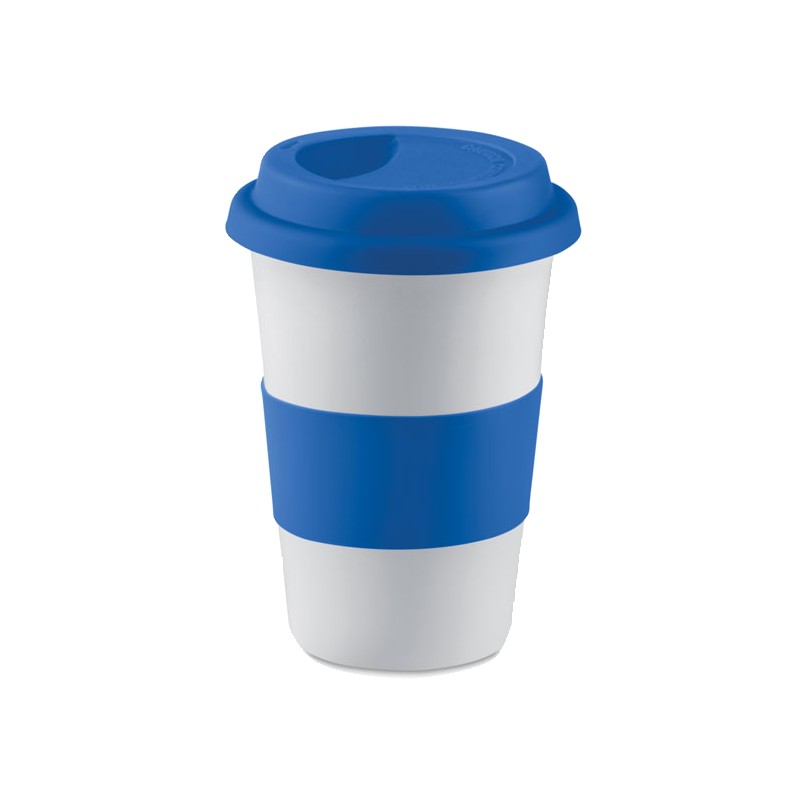 Mug simple paroi en céramique avec couvercle et bande en silicone. Capacité 400ml. La simple paroi n’exclut pas le transfert de chaleur.