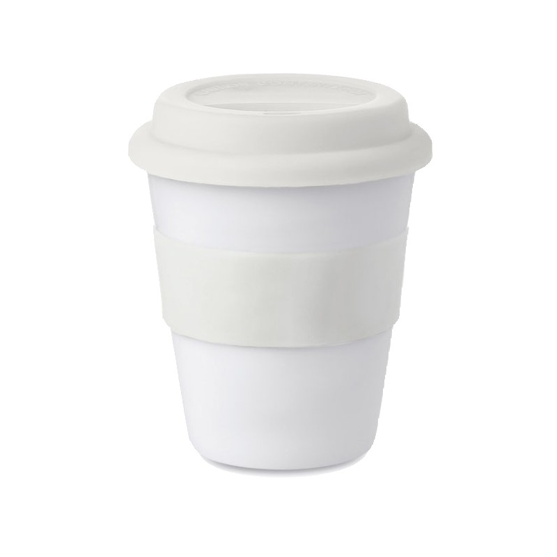 Gobelet simple paroi en PP blanc brillant avec couvercle et bande en silicone. Contenance 350ml. La simple paroi n’empêche pas le transfert de chaleur.