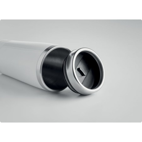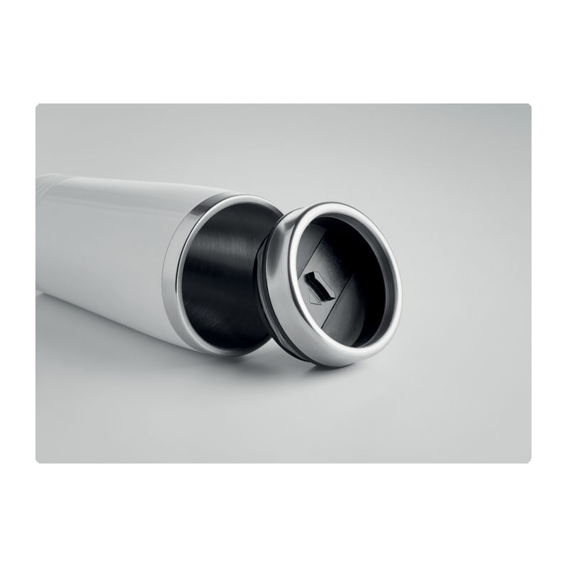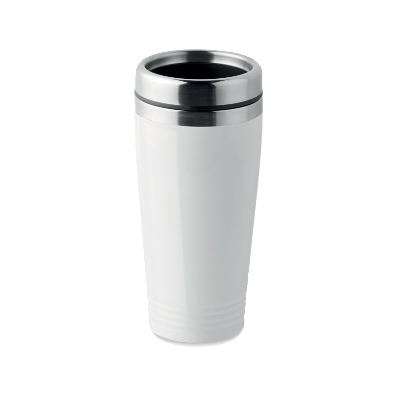 Tasse de voyage à double paroi en acier inoxydable avec couvercle en PP noir. Contenance : 400 ml.