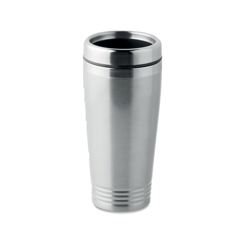 Tasse de voyage à double paroi en acier inoxydable avec couvercle en PP noir. Contenance : 400 ml.