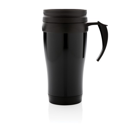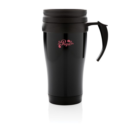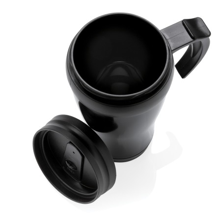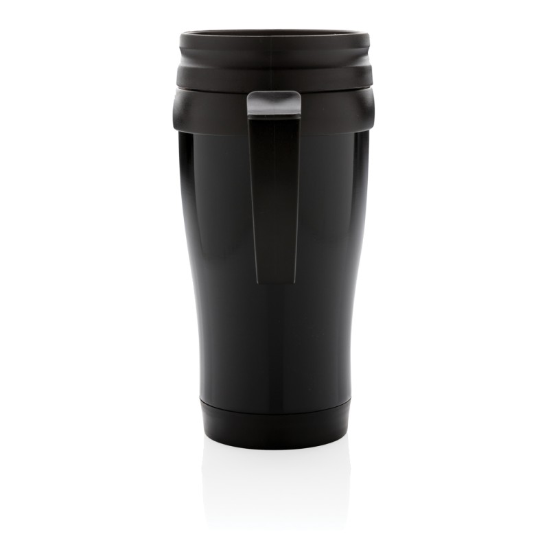 Mug 350ml, extérieur en acier inoxydable 201, intérieur en PP, fond et couvercle noirs. Garde les boissons chaudes jusqu'à 3h et froides jusqu'à 6h.