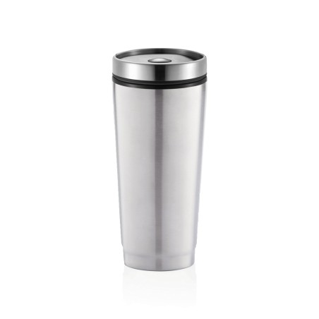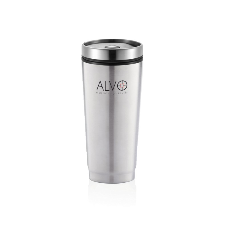 Mug 350ml, extérieur en acier inoxydable 201, intérieur en PP, couvercle vissé avec fermeture unique à bouton poussoir pour éviter les fuites. Peut être utilisé avec une seule main. Garde les boissons chaudes jusqu'à 3h et froides jusqu'à 6h. Modèle déposé®