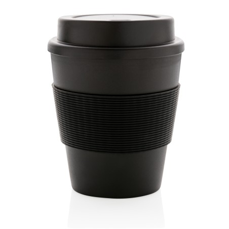 Mug 350ml en PP recyclable, couvercle à vis et bandeau de protection en silicone. Convient pour les boissons froides et les boissons chaudes jusqu'à 100 degrés.