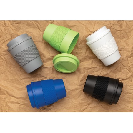 Mug 350ml en PP recyclable, couvercle à vis et bandeau de protection en silicone. Convient pour les boissons froides et les boissons chaudes jusqu'à 100 degrés.