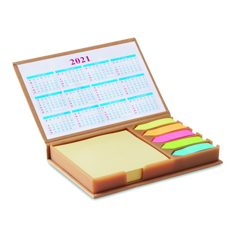 Set de notes de bureau avec calendrier. Bloc de notes adhésives jaunes en papier recyclé de grande taille. Marqueur flèche de 5 couleurs assorties. Calendrier de 4 ans sur la face intérieure du rabat.