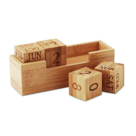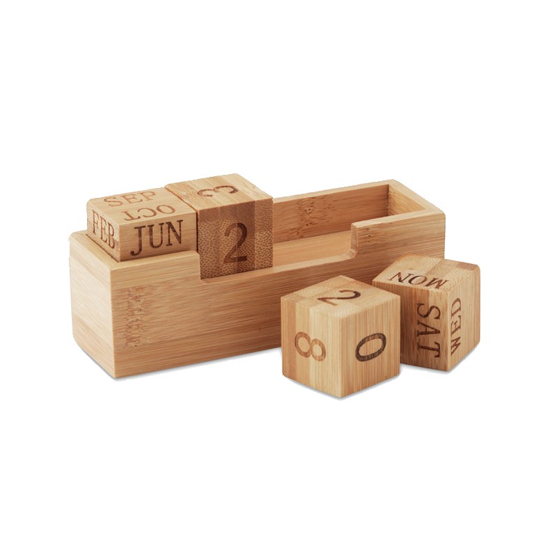 Calendrier de bureau perpétuel en bambou. Le bambou est un produit naturel, et présente de légères variations de couleur, de décoration et de tailles.