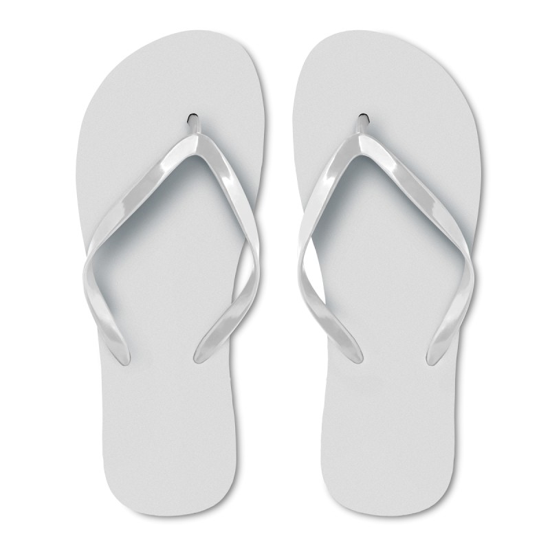 Tongs de plage, semelle en polyéthylène et lanière en PVC. 2 Tailles disponibles, M (entre 36 et 39) ou L (entre 40 et 43).