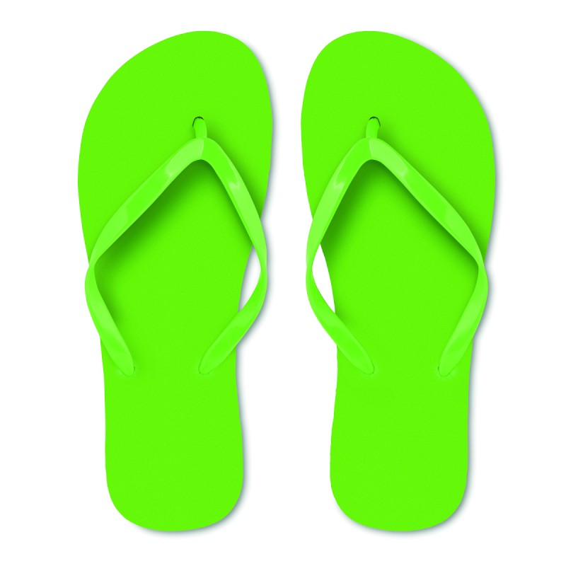 Tongs de plage, semelle en polyéthylène et lanière en PVC. 2 Tailles disponibles, M (entre 36 et 39) ou L (entre 40 et 43).