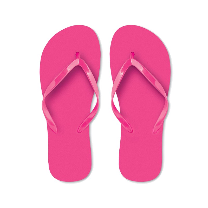 Tongs de plage, semelle en polyéthylène et lanière en PVC. 2 Tailles disponibles, M (entre 36 et 39) ou L (entre 40 et 43).