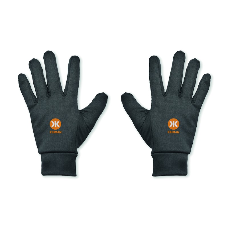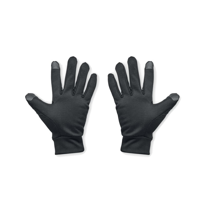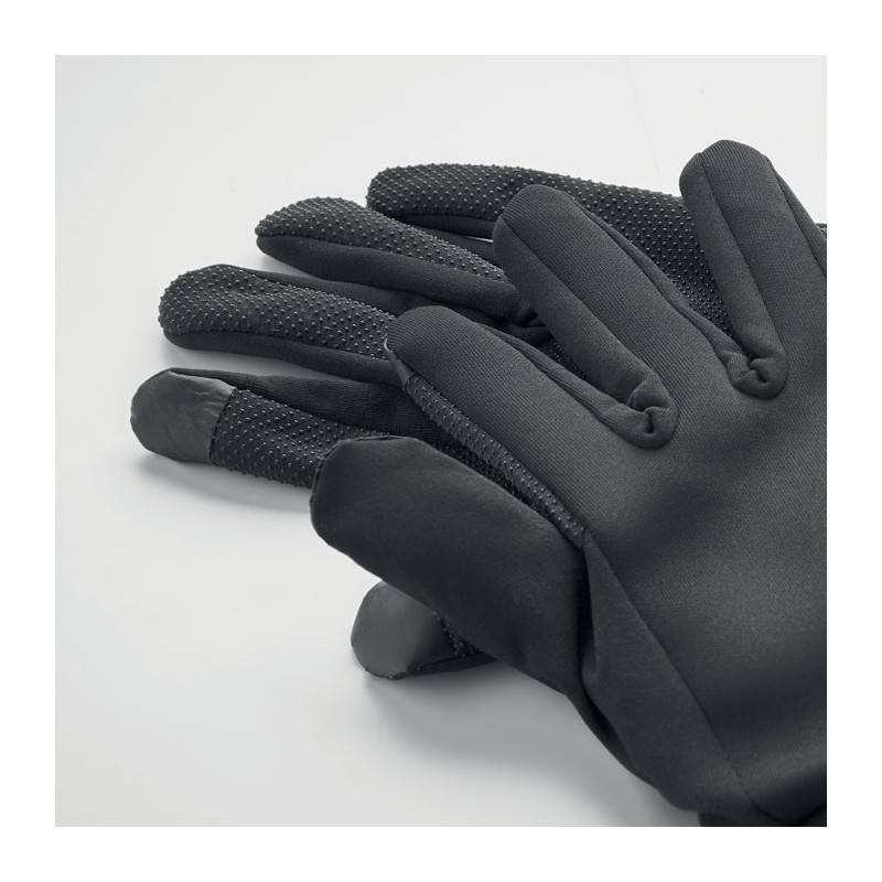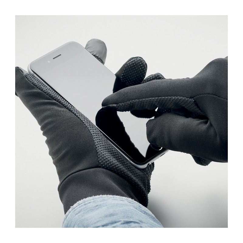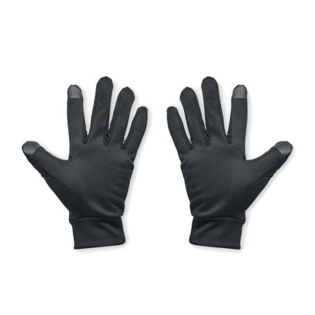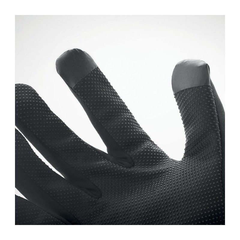 Gants de sport tactiles en polyester pour smartphone. Doigts en PVC dont deux avec fonction tactile et points antidérapants sur la paume.
