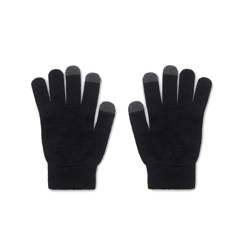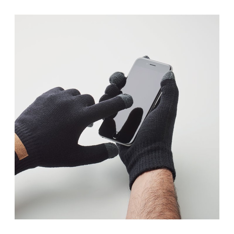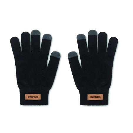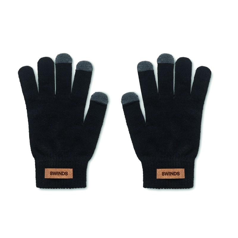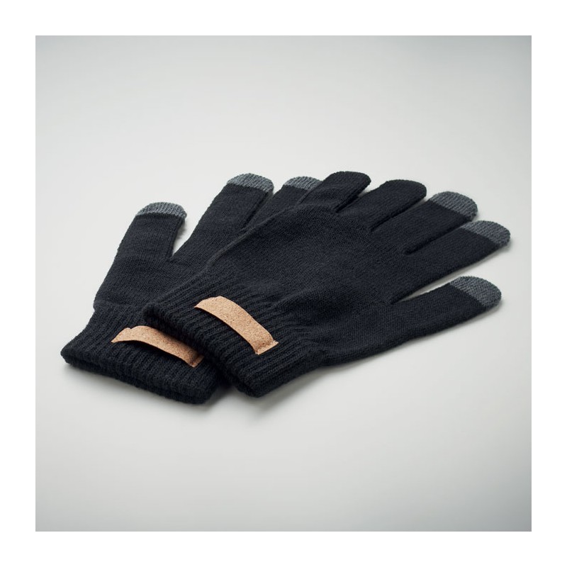 Gants tactiles pour smartphone en polyester RPET avec étiquette en liège pour la zone d'impression. Le liège est un matériau 100% naturel. En raison de sa structure et de la porosité de sa surface, le résultat final de l'impression par article peut présenter des différences.