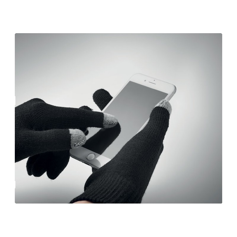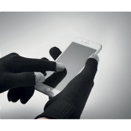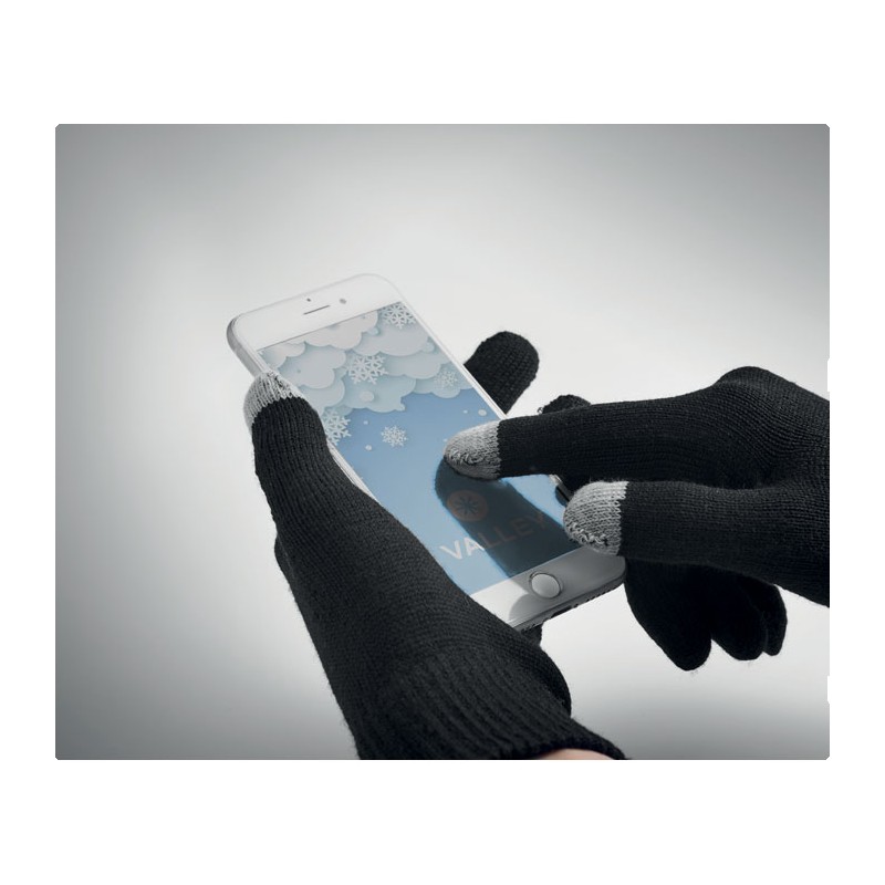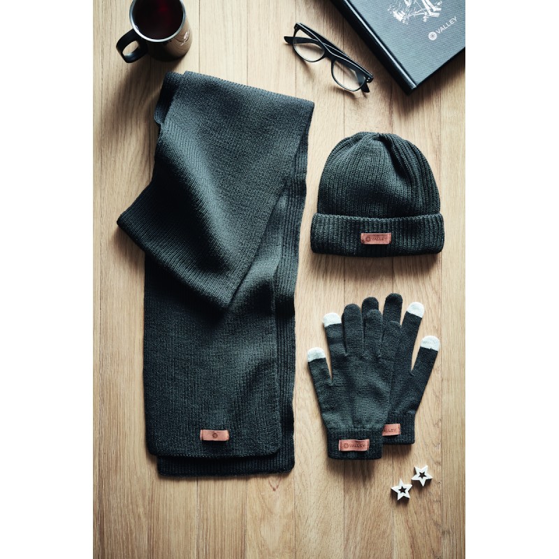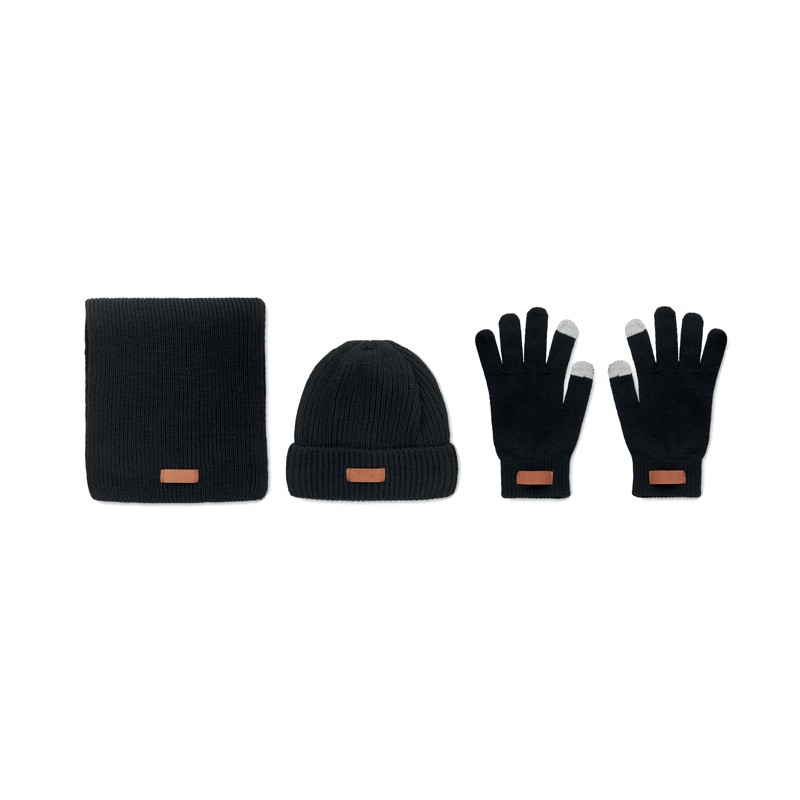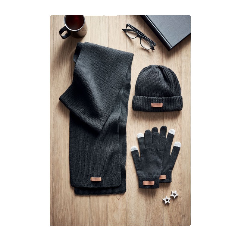 Ensemble d'hiver 3 pièces. Comprenant un bonnet en RPET, une écharpe et des gants tactiles avec une étiquette pour la zone d'impression. Taille adulte unique.