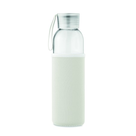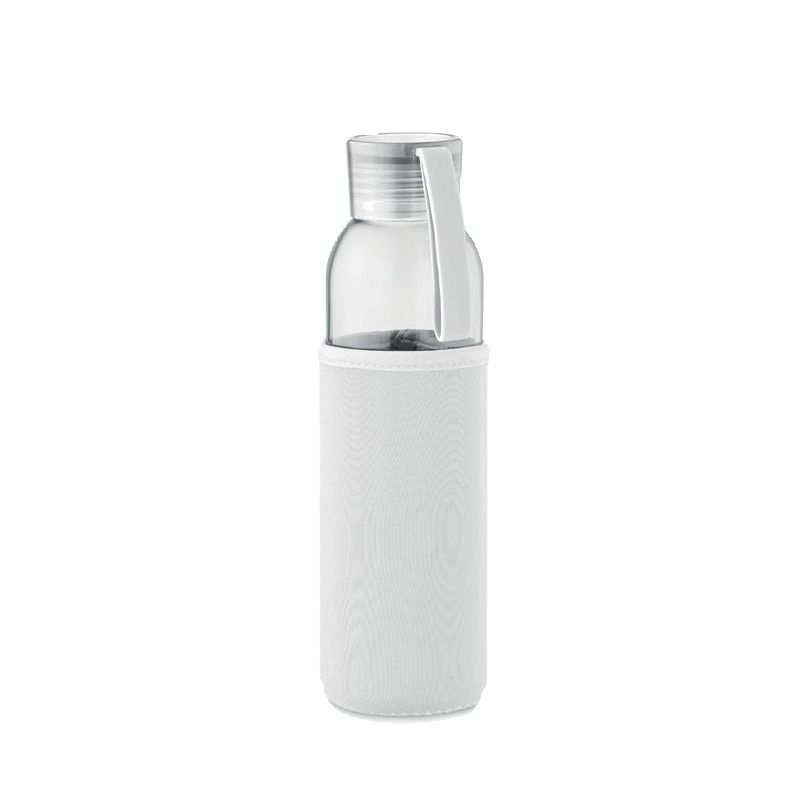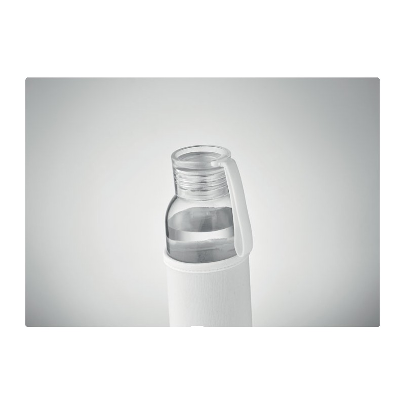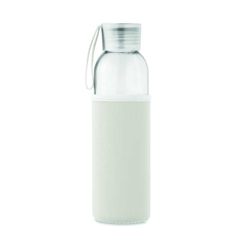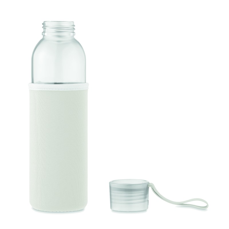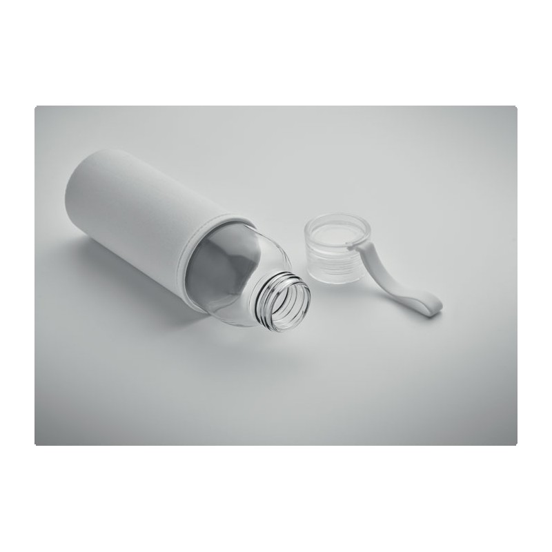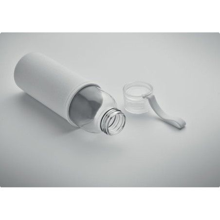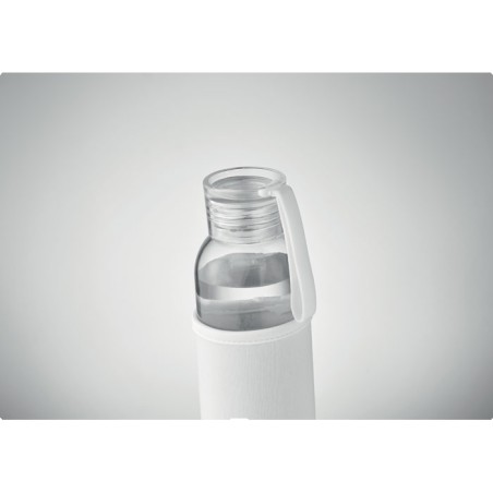 Bouteille en verre recyclé avec pochette en néoprène et couvercle en PP avec cordon en silicone. Anti fuite. Capacité : 500 ml.