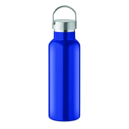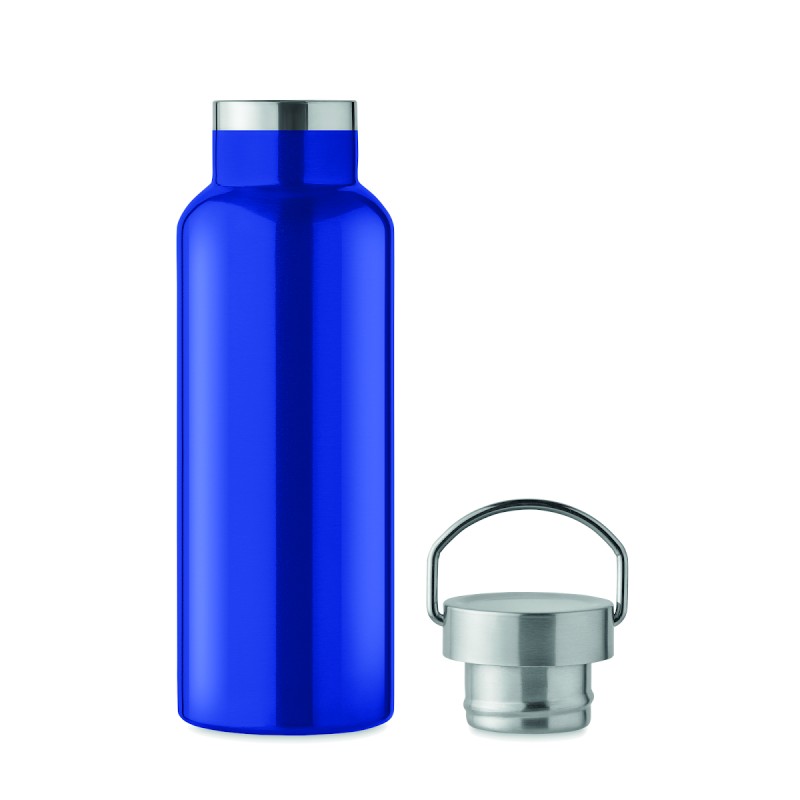 Bouteille à vide isolant à double paroi en acier inoxydable recyclé (90 % d'acier inoxydable recyclé et 10 % d'acier inoxydable) avec couvercle et poignée. Anti fuite. Capacité : 500 ml.