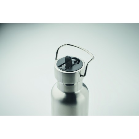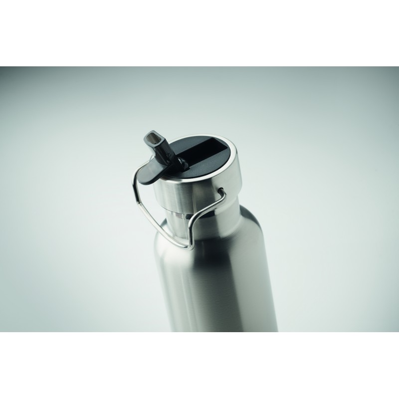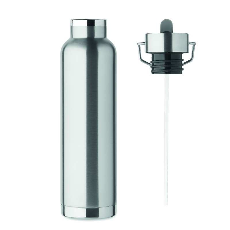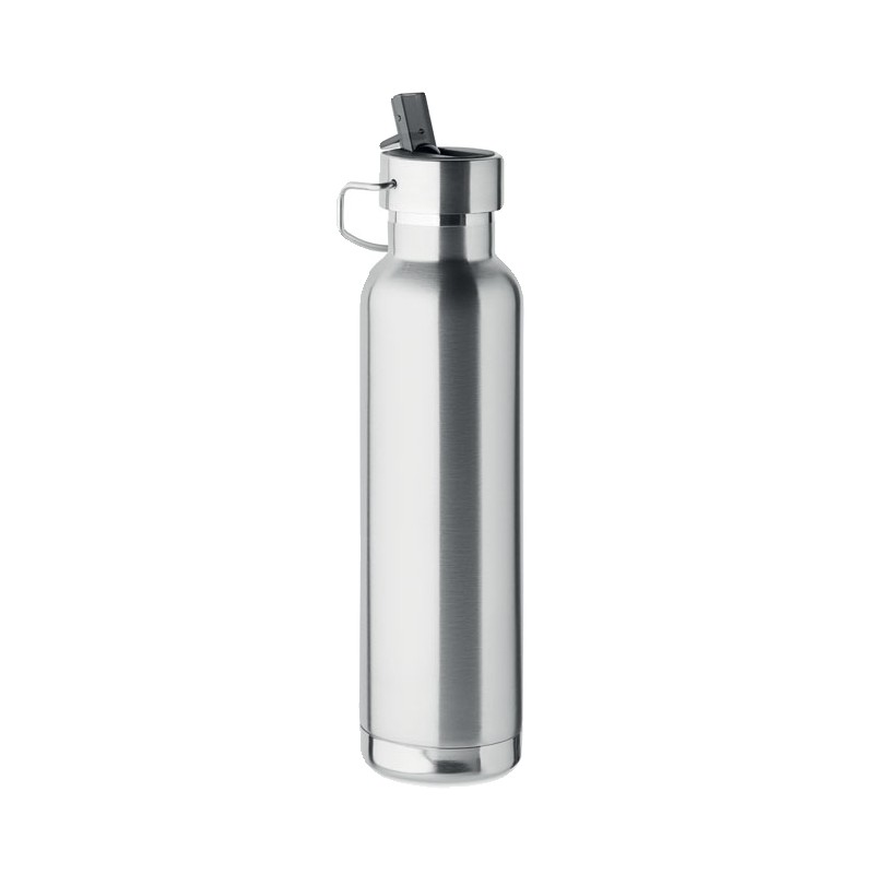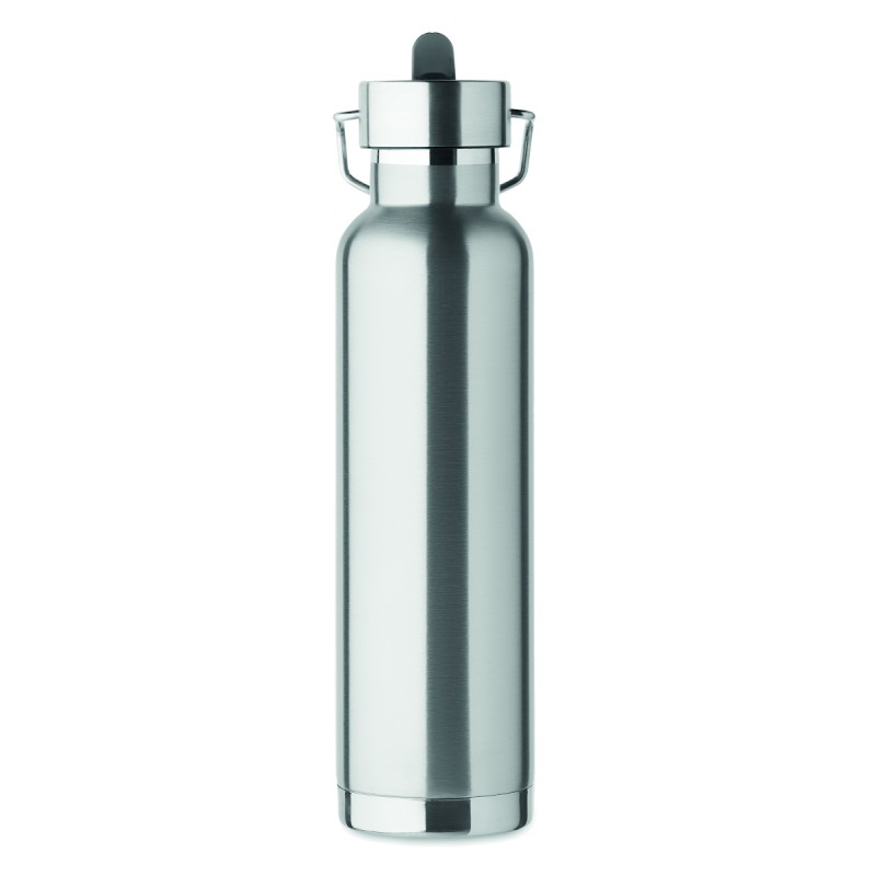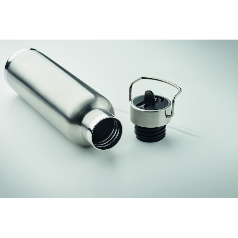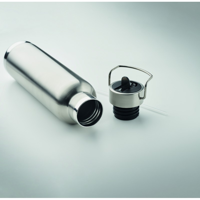 Bouteille isolante sous vide à double paroi en acier inoxydable recyclé (90 % d'acier inoxydable recyclé et 10 % d'acier inoxydable) avec paille intégrée et poignée de fermeture. Capacité : 660 ml.