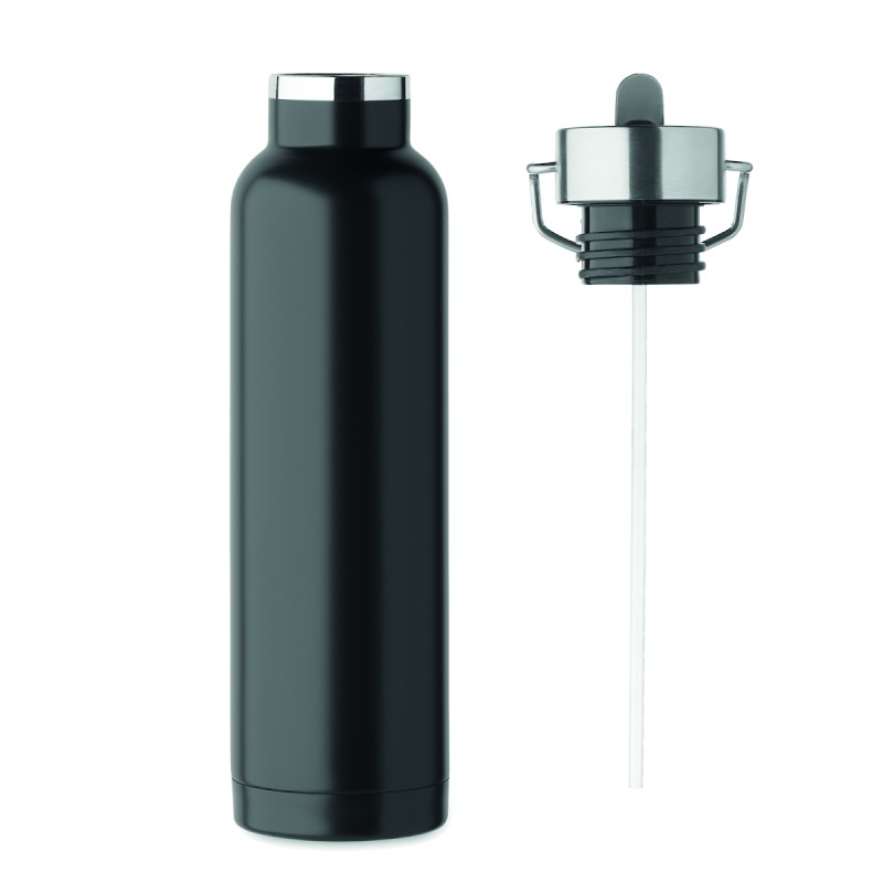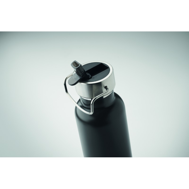 Bouteille isolante sous vide à double paroi en acier inoxydable recyclé (90 % d'acier inoxydable recyclé et 10 % d'acier inoxydable) avec paille intégrée et poignée de fermeture. Capacité : 660 ml.