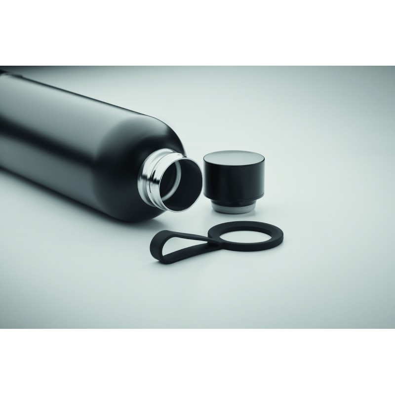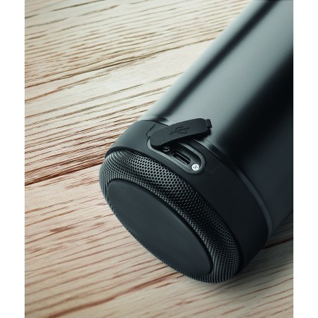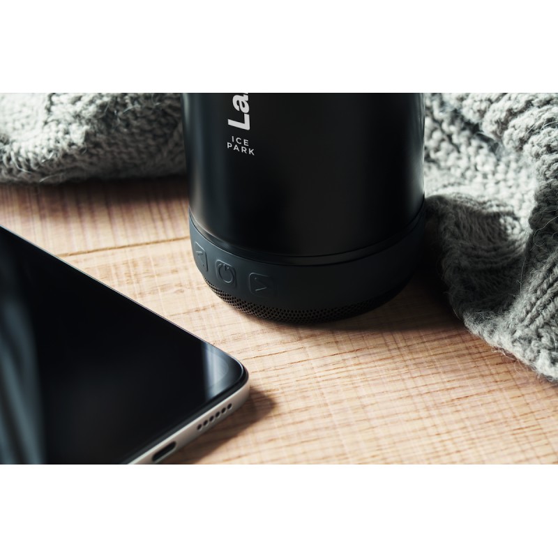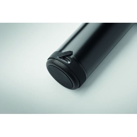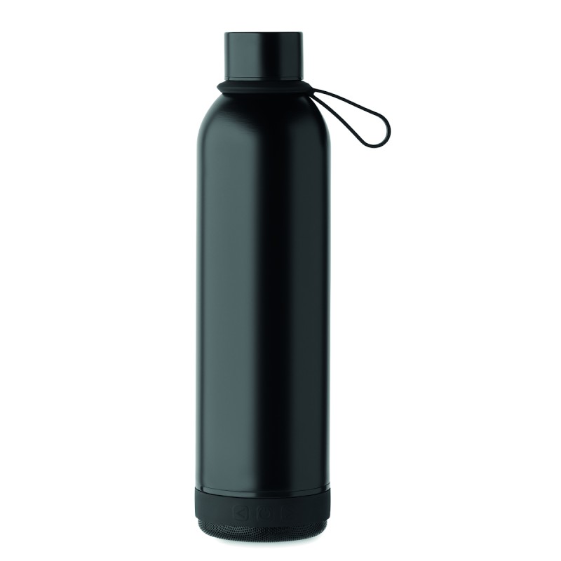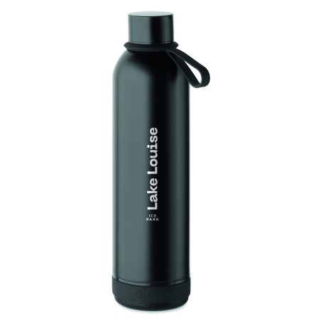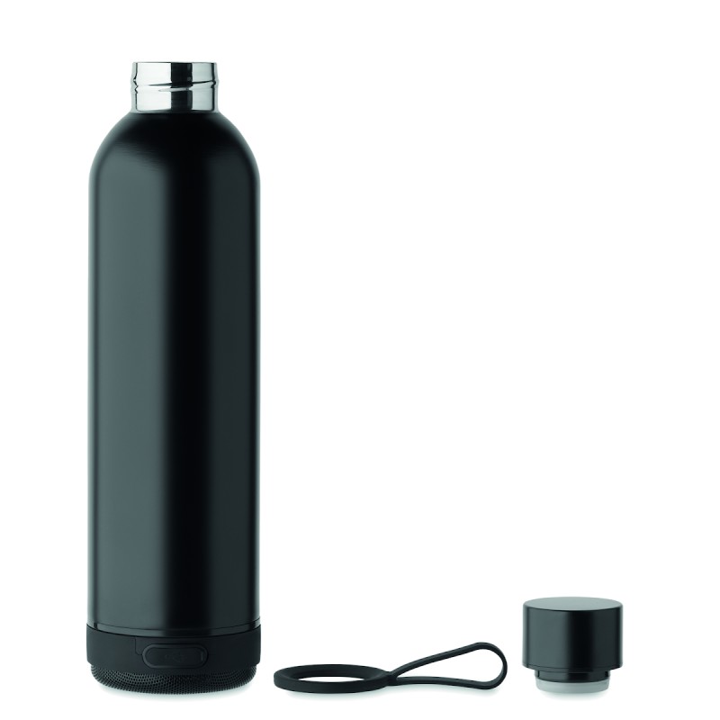 Bouteille isotherme sous vide double paroi en inox recyclé (90% inox recyclé et 10% inox) et poignée de transport en silicone avec haut-parleur sans fil 3W amovible. Capacité : 500 ml. Batterie de 500 mAh. Retirez le haut-parleur pour le nettoyer. Anti fuite.