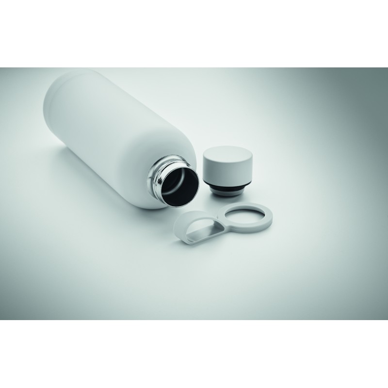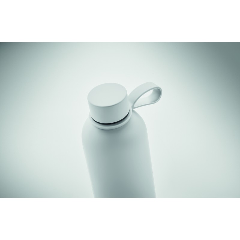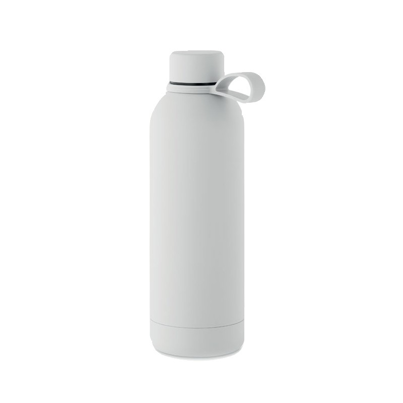 Bouteille isolante sous vide à double paroi en acier inoxydable recyclé (90 % d'acier inoxydable recyclé et 10 % d'acier inoxydable) avec finition en caoutchouc et poignée en silicone. Anti fuite. Capacité : 500 ml.