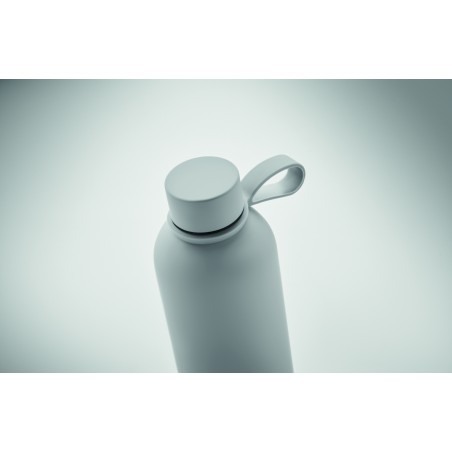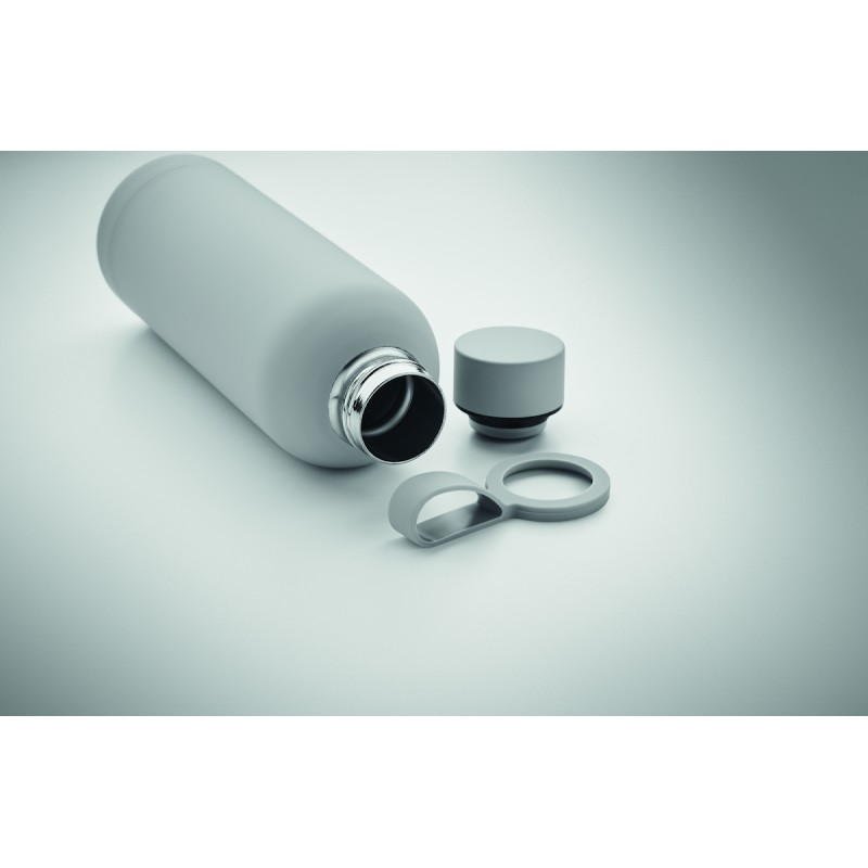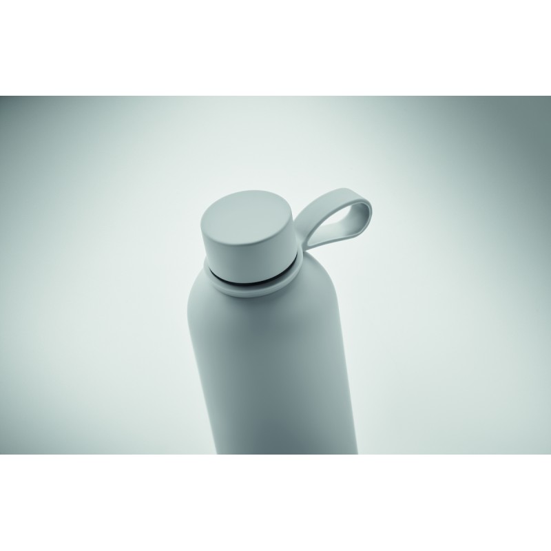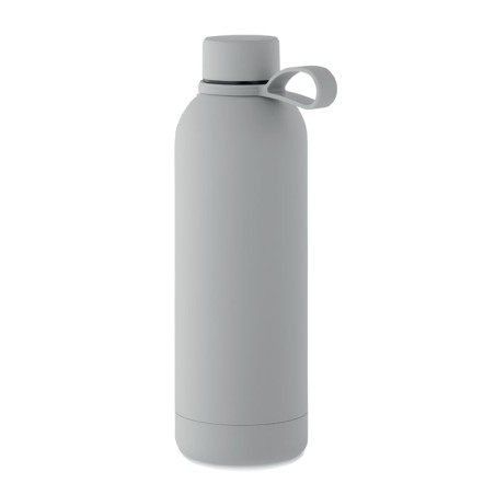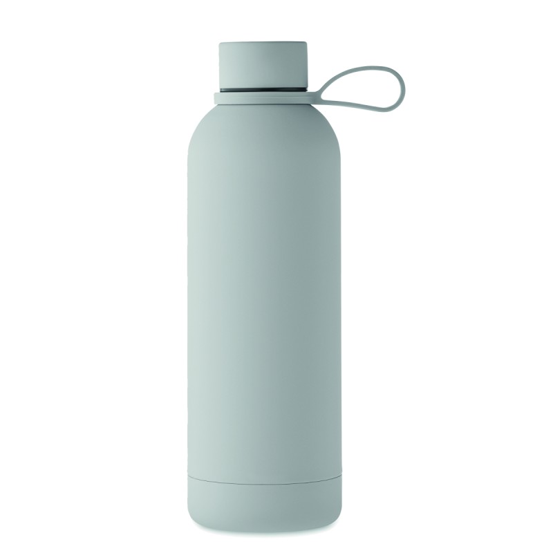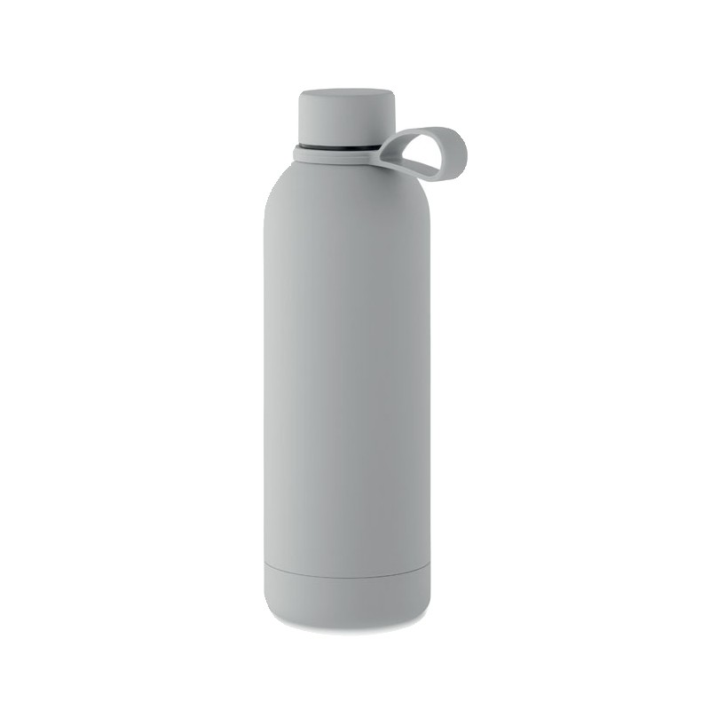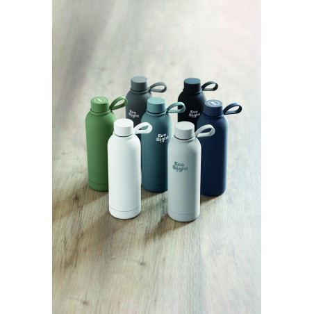 Bouteille isolante sous vide à double paroi en acier inoxydable recyclé (90 % d'acier inoxydable recyclé et 10 % d'acier inoxydable) avec finition en caoutchouc et poignée en silicone. Anti fuite. Capacité : 500 ml.