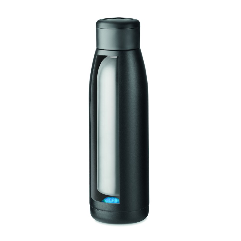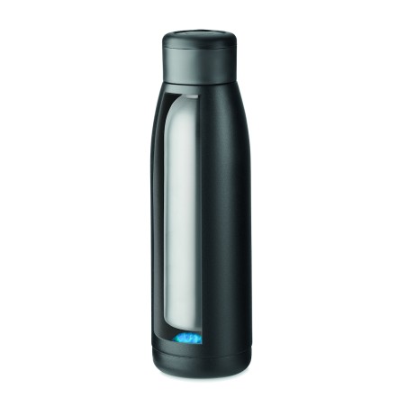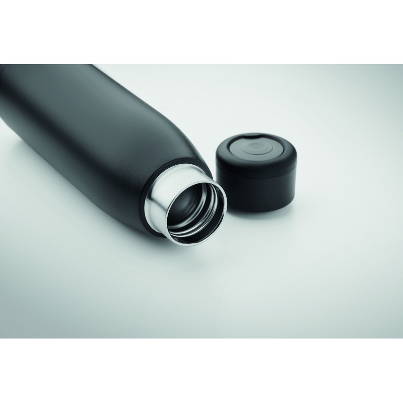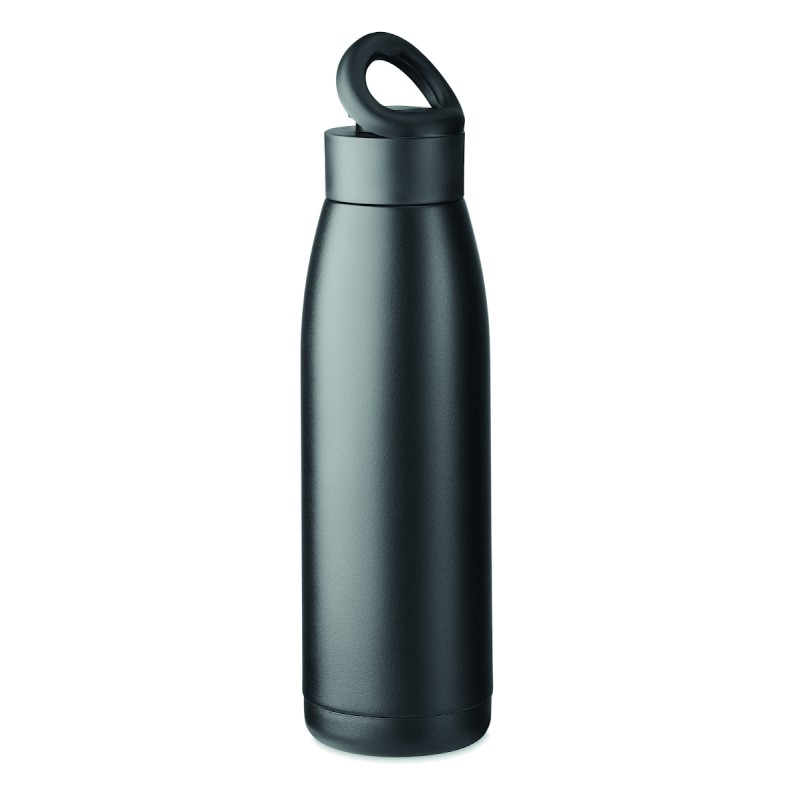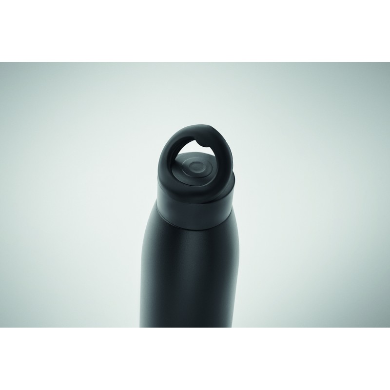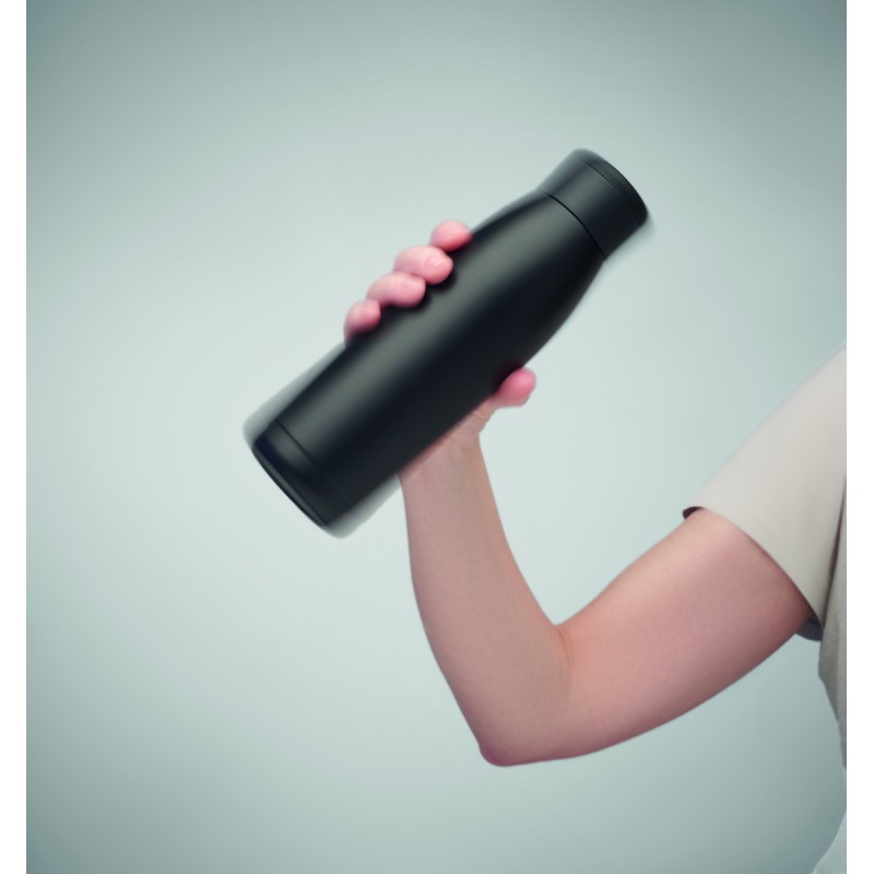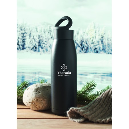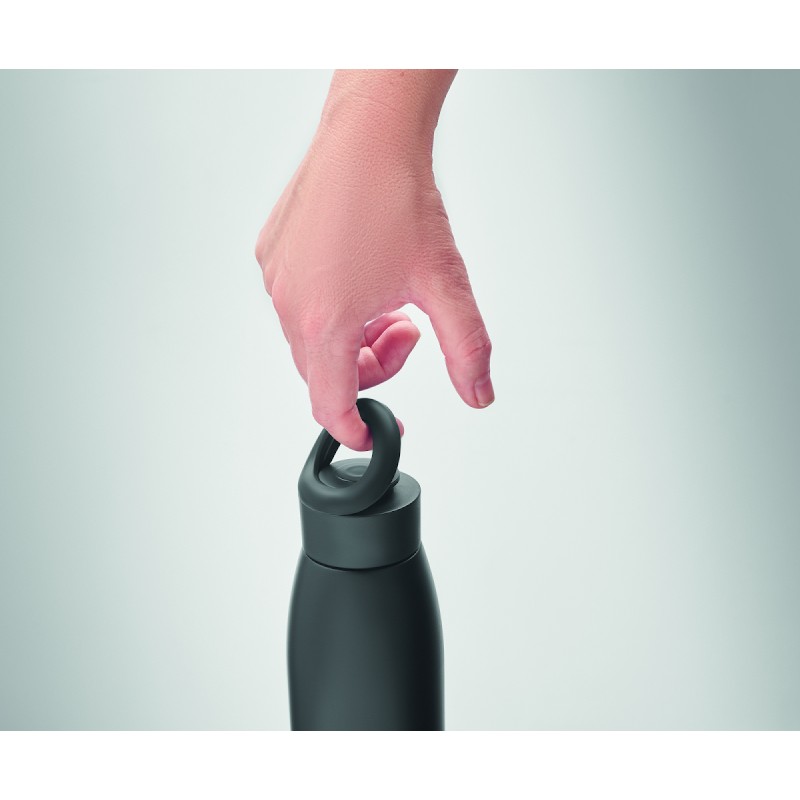 Bouteille à double paroi en acier inox recyclé (90 % d'acier inox recyclé et 10 % d'acier inox) avec couvercle souple en silicone. Agiter la bouteille pour que la température de la surface se réchauffe ou se refroidisse, en fonction du liquide contenu. 400ml. Anti fuite