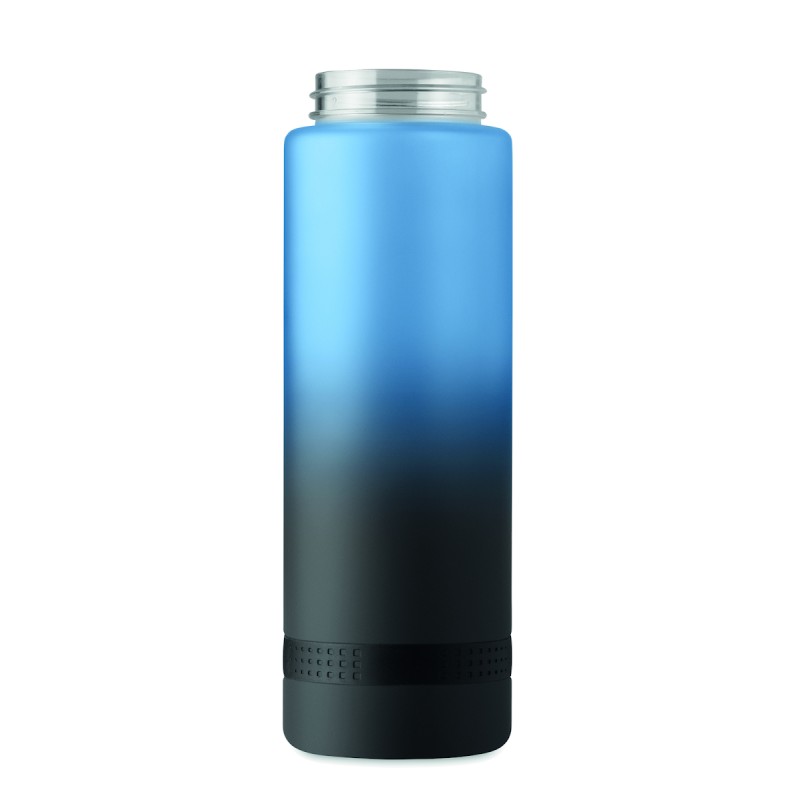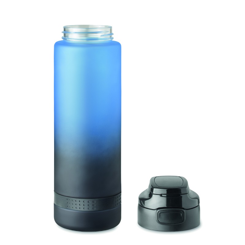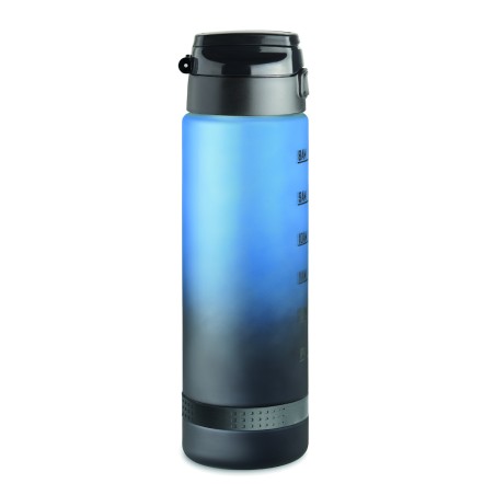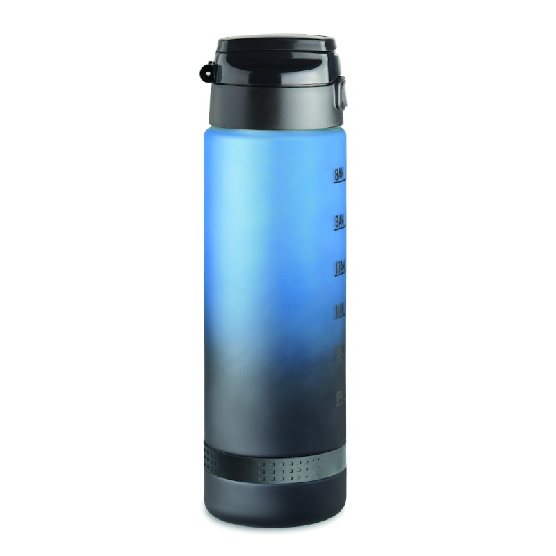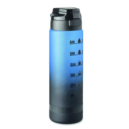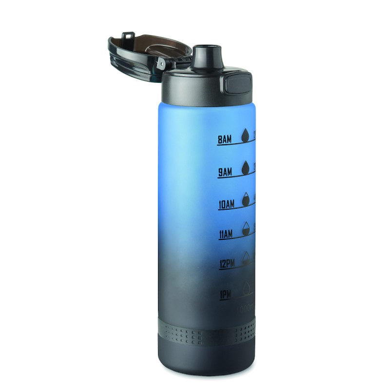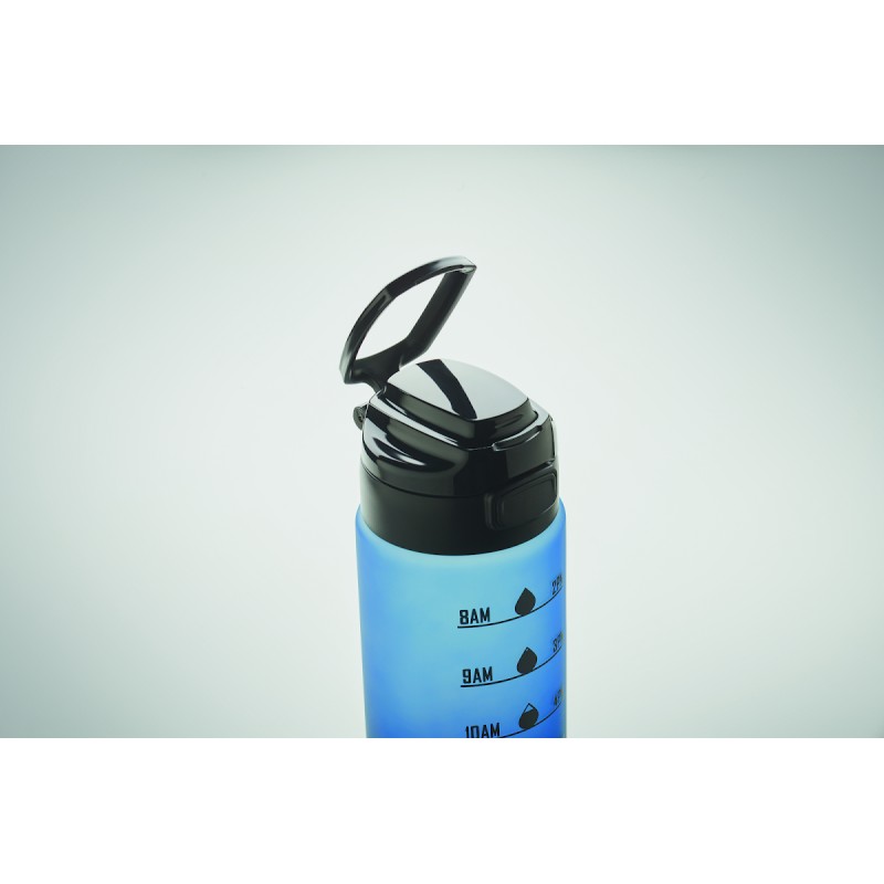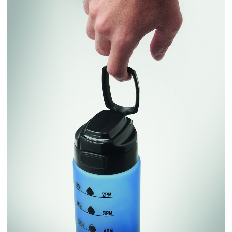 Bouteille de sport en RPET, graduation temps/contenance, couvercle rabattable à ouverture d’une seule main, verrou de sécurité et poignée.Anti fuite. Contenance : 1L.