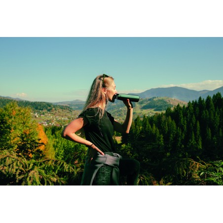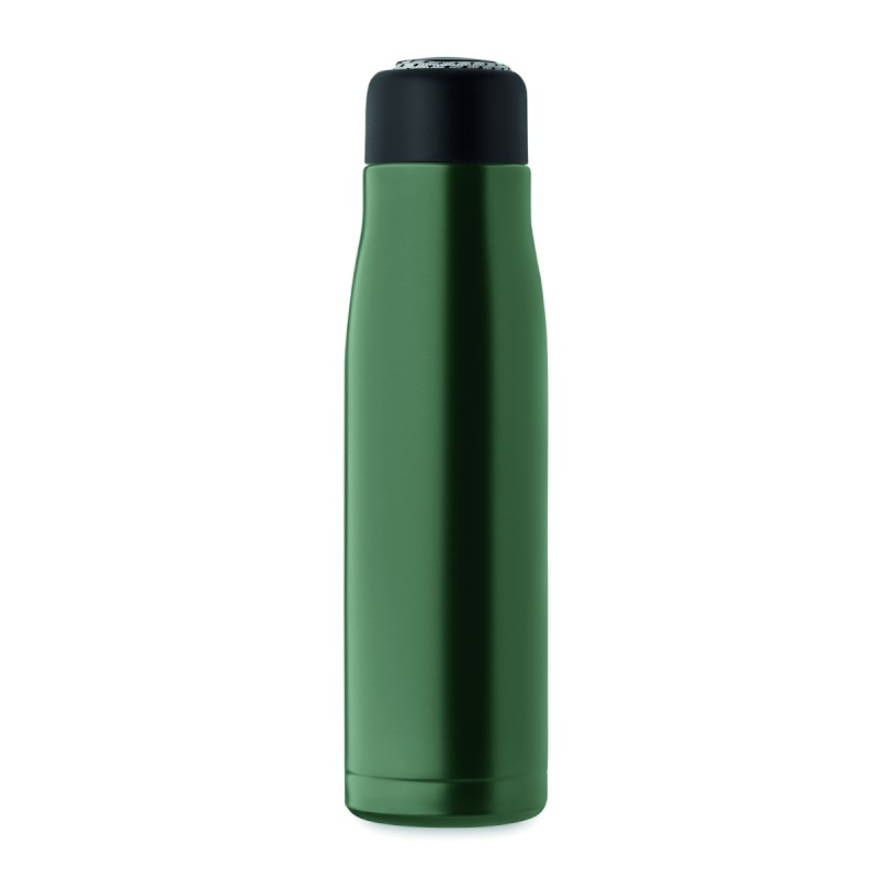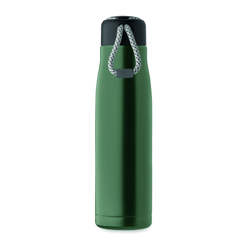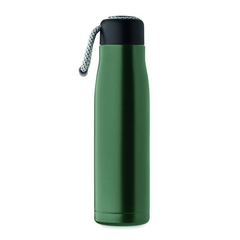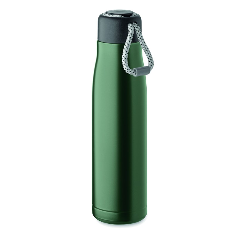 Bouteille à double paroi en acier inoxydable recyclé (90 % d'acier inoxydable recyclé et 10 % d'acier inoxydable) avec poignée en corde insérée dans le bouchon en PP. Anti fuite. Capacité : 500 ml.