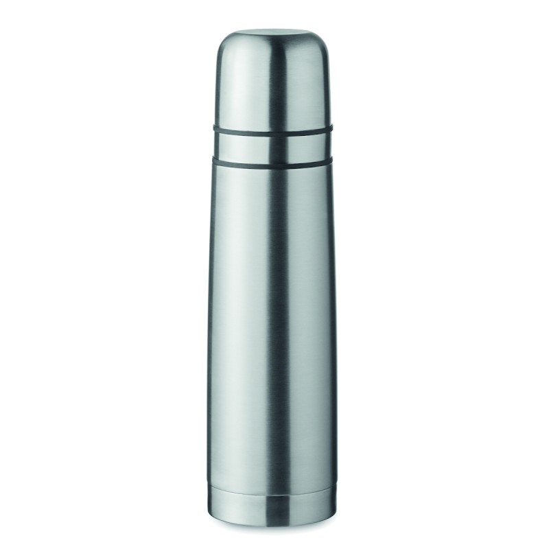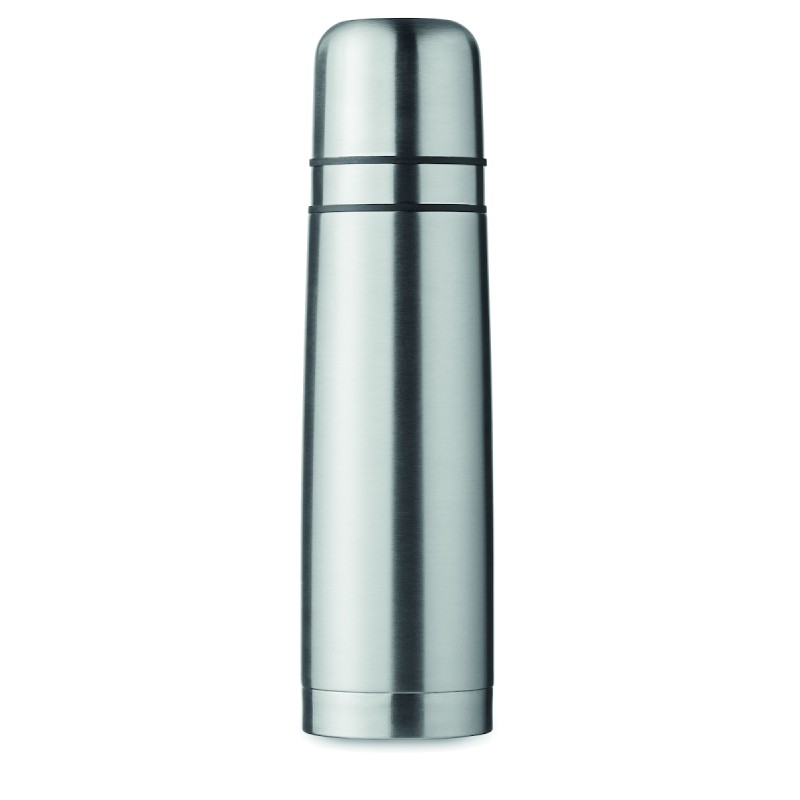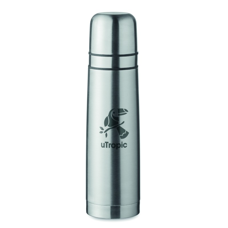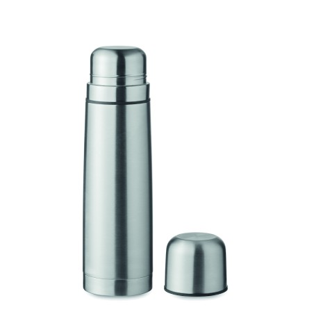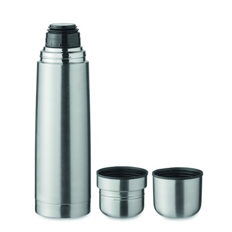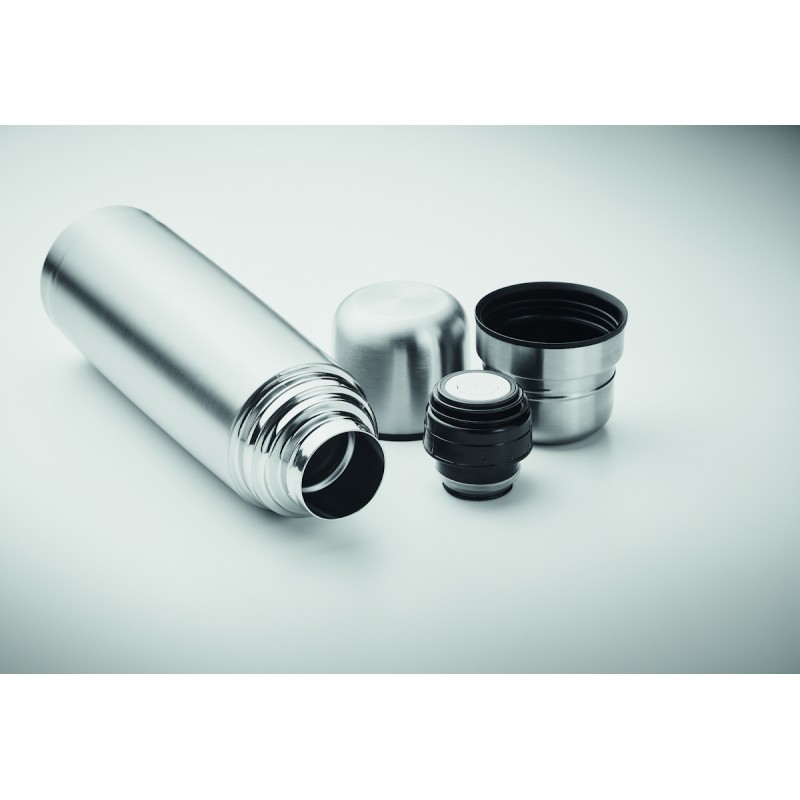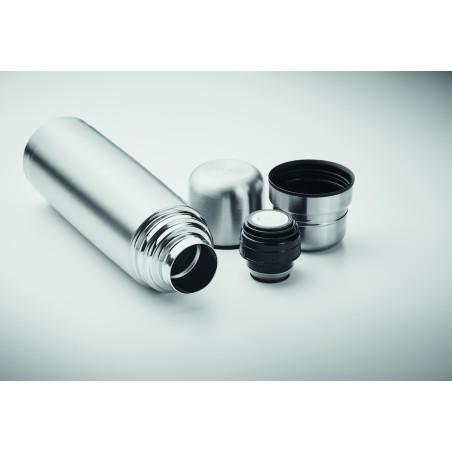 Bouteille isotherme à double paroi en acier inoxydable recyclé (90 % d'acier inoxydable recyclé et 10 % d'acier inoxydable) avec 2 gobelets intégrés (paroi intérieure en PP) dans le couvercle. Capacité bouteille : 750 ml, gobelet extérieur : 150 ml, gobelet intérieur : 125ml.
