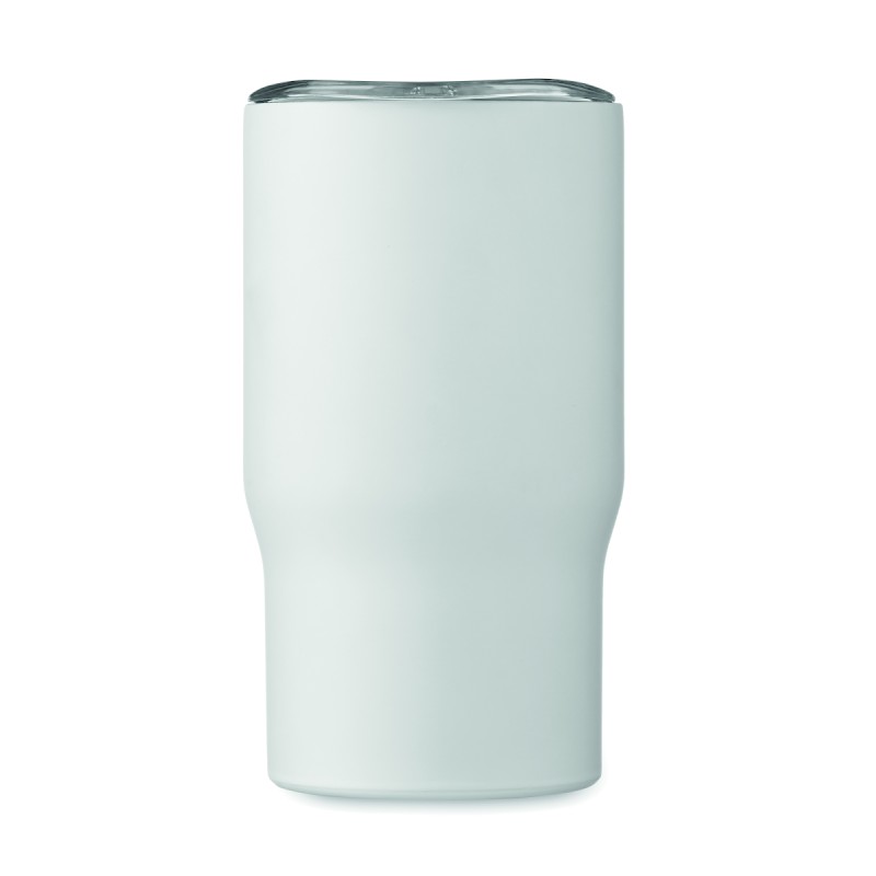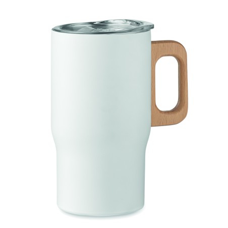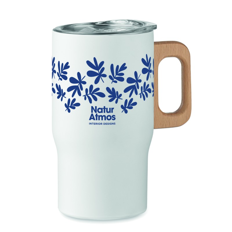 Gobelet à double paroi en acier inoxydable recyclé (90 % d'acier inoxydable recyclé et 10 % d'acier inoxydable) avec poignée en bois et ouverture coulissante. Capacité : 350 ml.