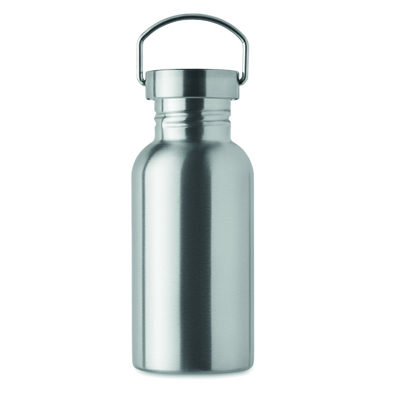 Bouteille à simple paroi en acier inoxydable recyclé (90 % d'acier inoxydable recyclé et 10 % d'acier inoxydable) avec bouchon et poignée. Anti fuite. Capacité : 500 ml. Comme il s'agit d'un flacon à paroi simple, un transfert de chaleur peut encore se produire.