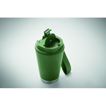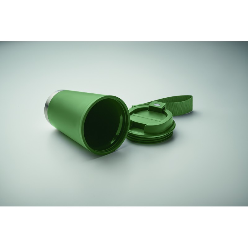 Gobelet à double paroi intérienr en PP, extérieur en PP recyclé, détails en acier inoxydable recyclé et bracelet en RPET. Capacité : 300 ml.