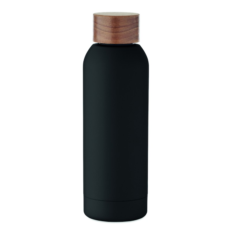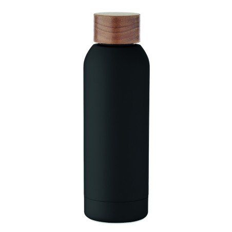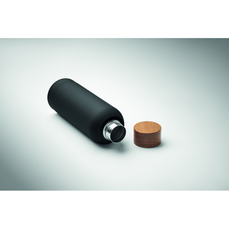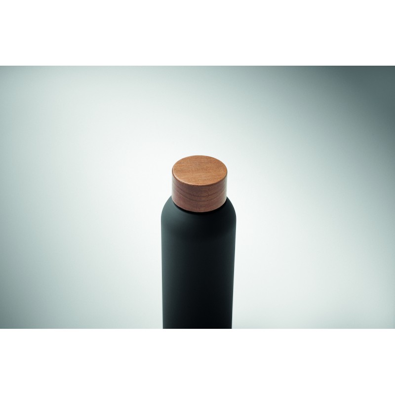 Bouteille à simple paroi en acier inoxydable recyclé à 90 % et acier inoxydable à 10 %, avec finition en caoutchouc et couvercle en bois d'acacia. Anti fuite. Capacité : 700 ml. Comme il s'agit d'une simple paroi, un transfert de chaleur peut encore se produire.