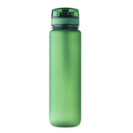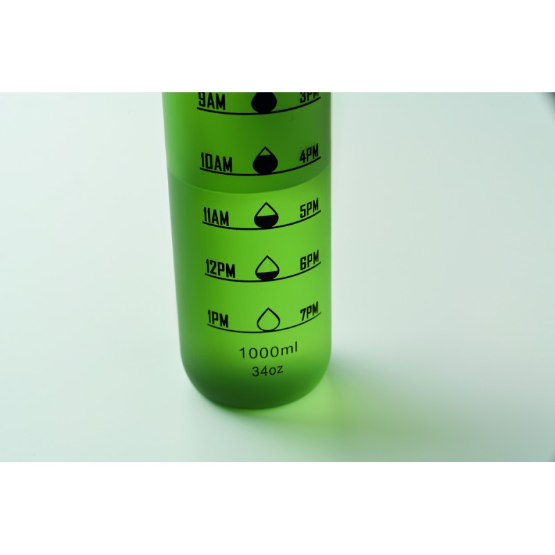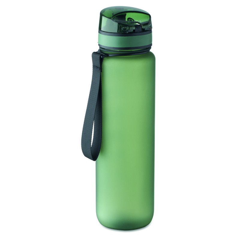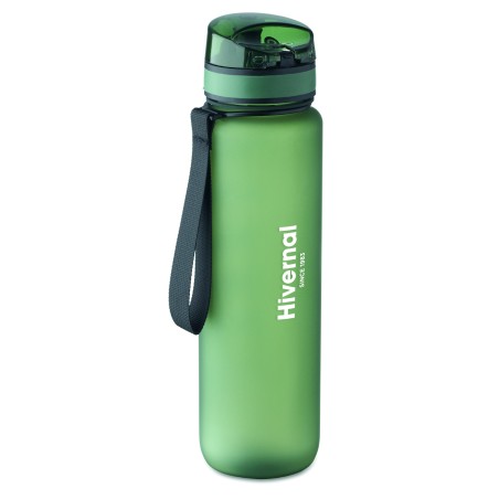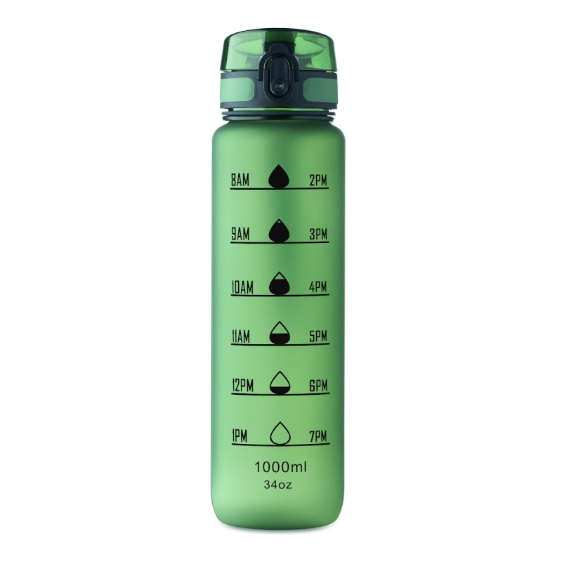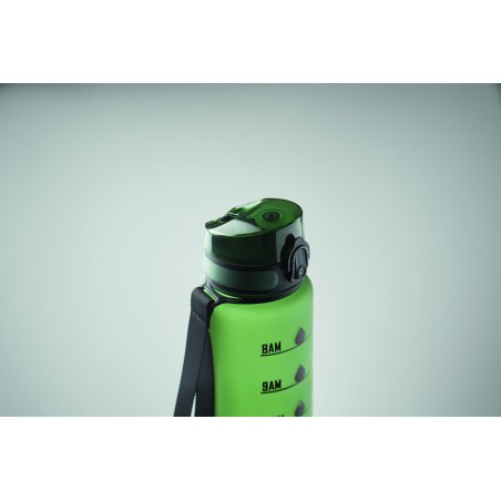 Bouteille de sport en RPET, marqueurs de temps motivants, couvercle à ouverture d'une seule main, fermeture de sécurité et sangle de transport. Anti fuite. Capacité : 1 litre.