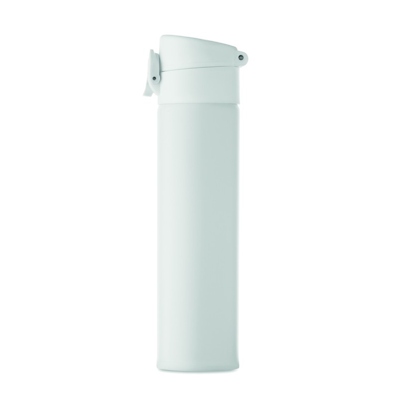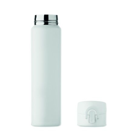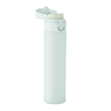 Bouteille à double paroi en acier inoxydable recyclé (90 % d'acier inoxydable recyclé et 10 % d'acier inoxydable) avec fermeture de sécurité sur le couvercle et option d'ouverture par pression. Anti fuite. Capacité 300 ml.