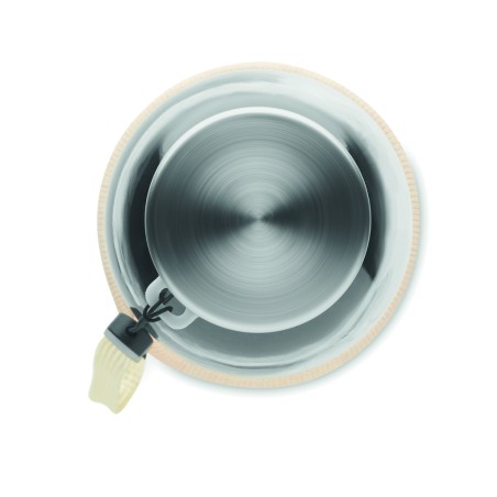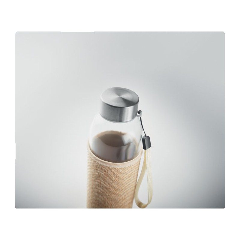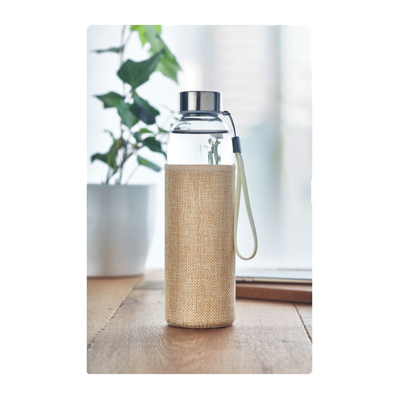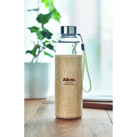 Bouteille en verre dans une housse en néoprène et jute. Contenance : 500 ml. Ne convient pas aux boissons gazeuses. Anti fuite.