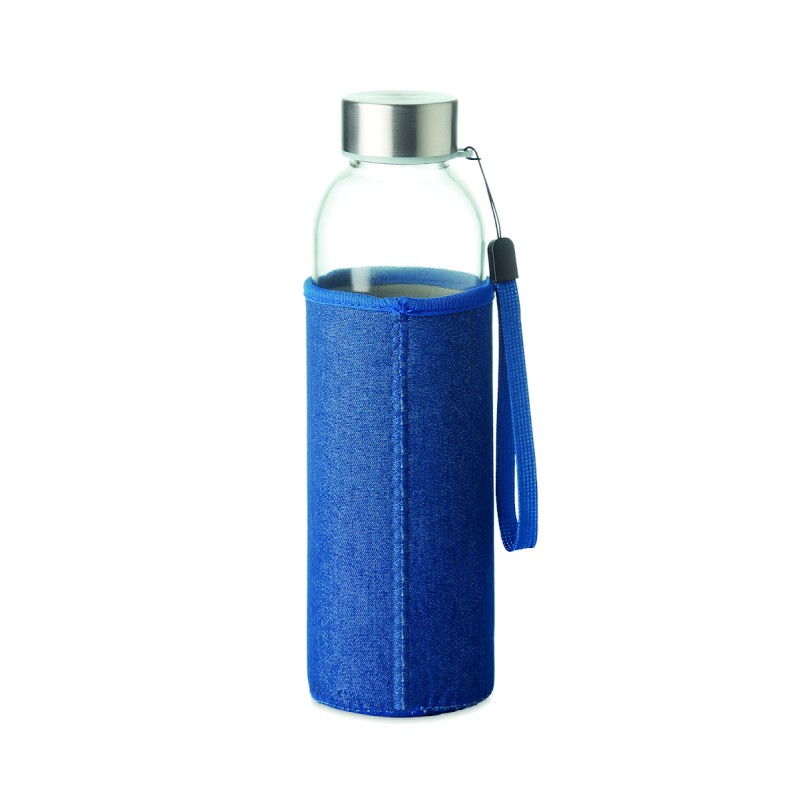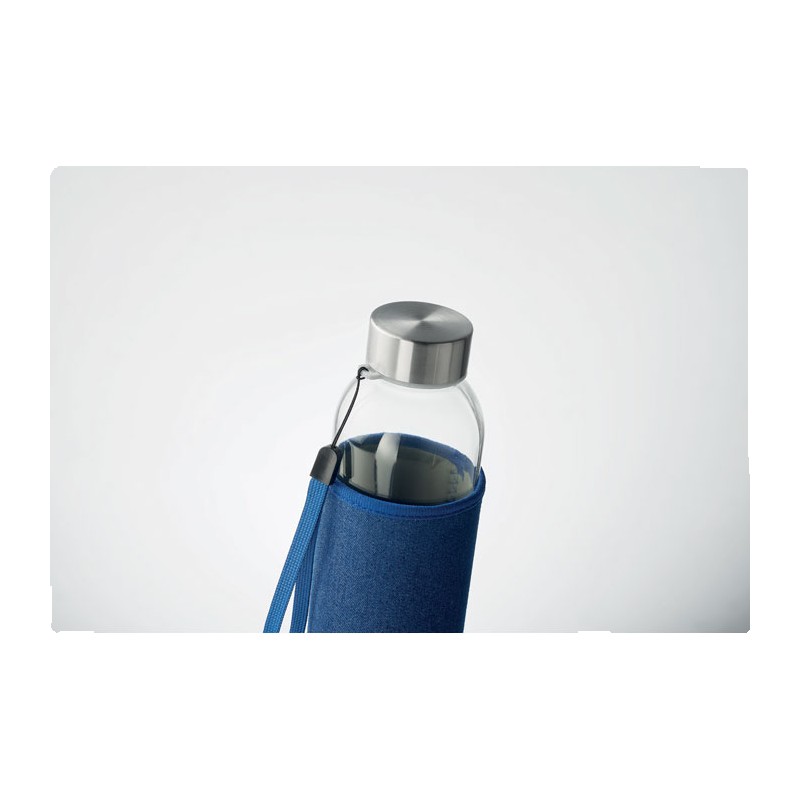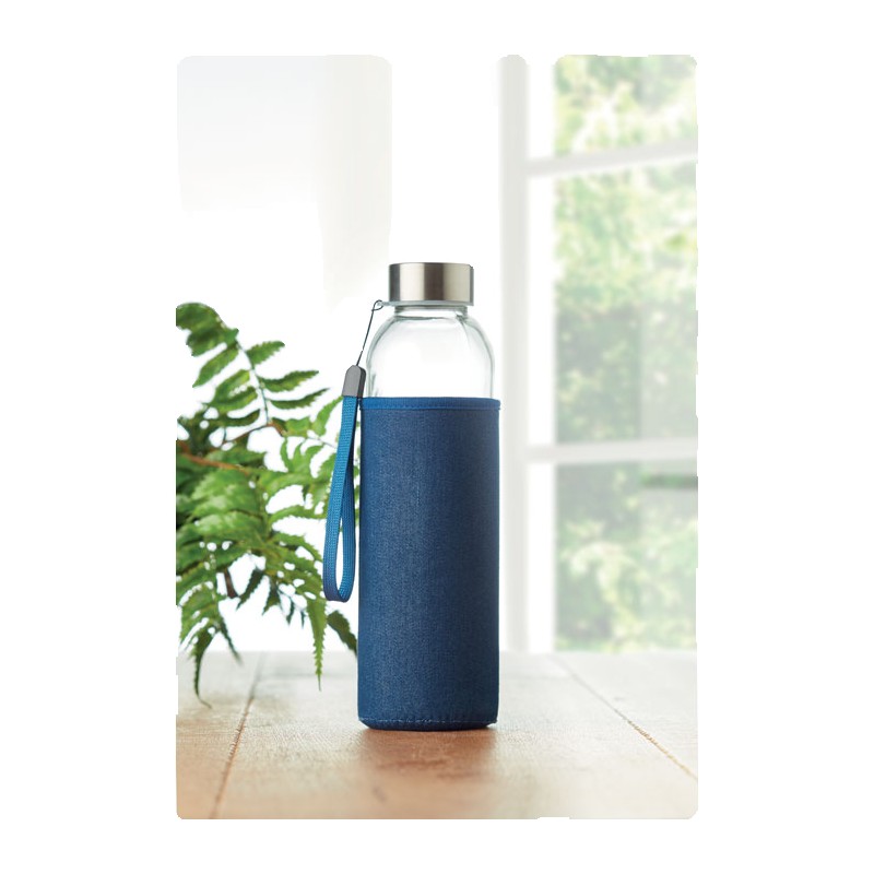 Bouteille en verre avec pochette en néoprène aspect denim. Contenance : 500 ml. Ne convient pas aux boissons gazeuses. Anti fuite.