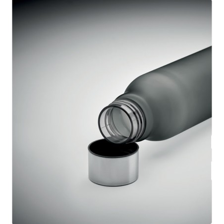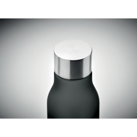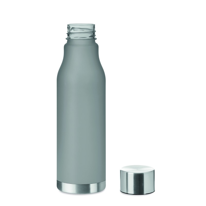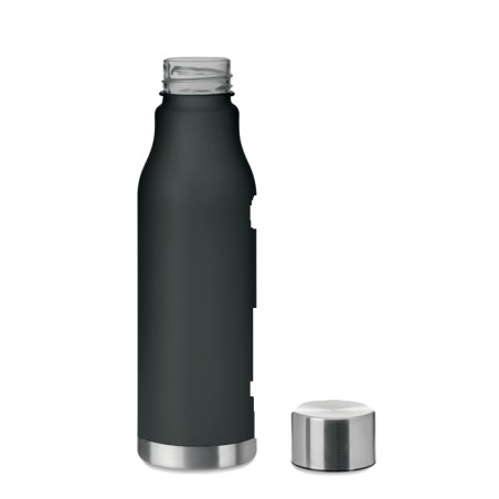 Bouteille en RPET avec finition caoutchoutée et acier inoxydable. Bouchon intérieur en RPET et anneau en silicone. Sans BPA. Anti fuite. Contenance : 600 ml. Ne convient pas aux boissons gazeusesAnti fuite.