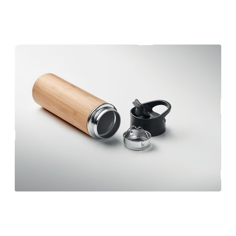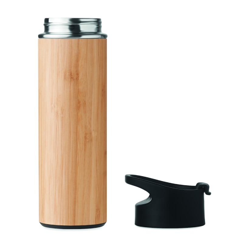 Bouteille à vide isolant à double paroi en acier inoxydable avec couvercle extérieur en bambou et couvercle à poignée en PP. Capacité : 450ml. Gardez vos boissons froides ou chaudes avec cette bouteille isotherme. Que vous aimiez le café, le thé ou d'autres boissons chaudes, avec cette bouteille vous pourrez facilement les emporter avec vous grâce au couvercle à poignée. Le revêtement en bambou donne à la bouteille un aspect naturel et la distingue des autres bouteilles. anti fuite. Le bambou est un produit naturel, il peut y avoir de légères variations de couleur et de taille par article, ce qui peut affecter le résultat final de la décoration. FSC®-certified | FSC 100%, N5.7, FSC-C213206