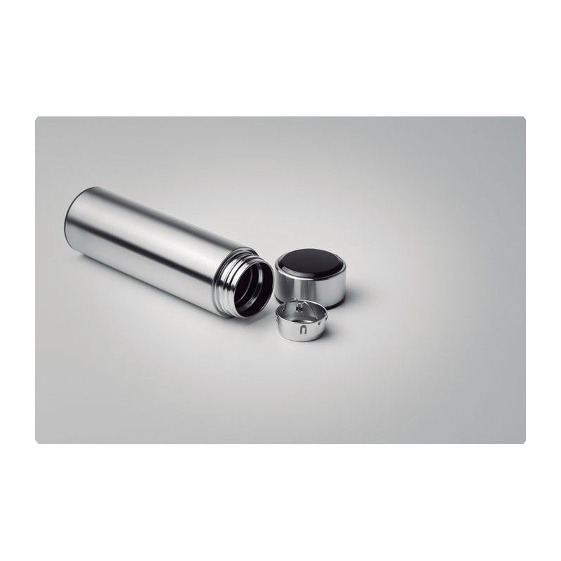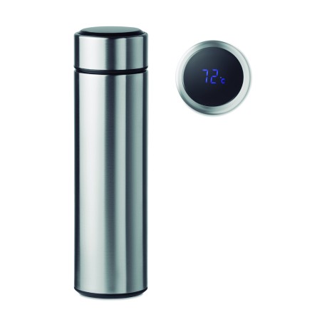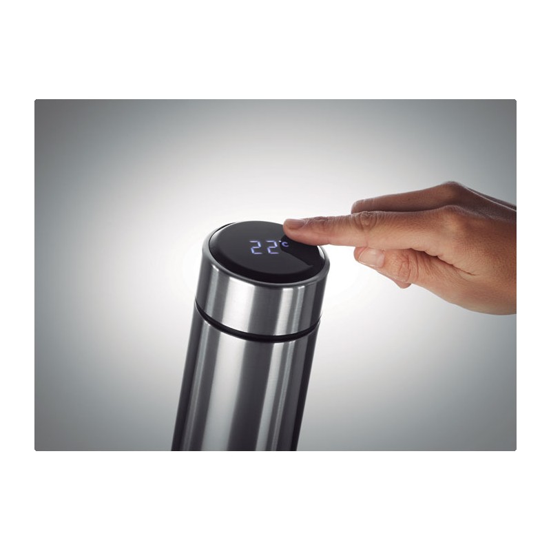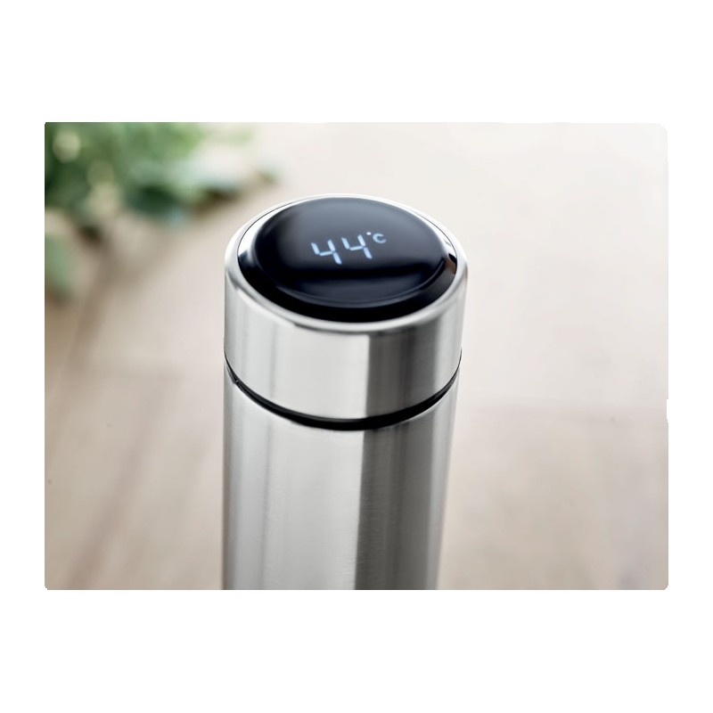 Bouteille à vide isolant en acier inoxydable à double paroi. Comprenant un thermomètre à LED tactile sur le couvercle et un infuseur à thé à l'intérieur. 1 pile CR2032. Étanche. Capacité 450 ml. Anti fuite.