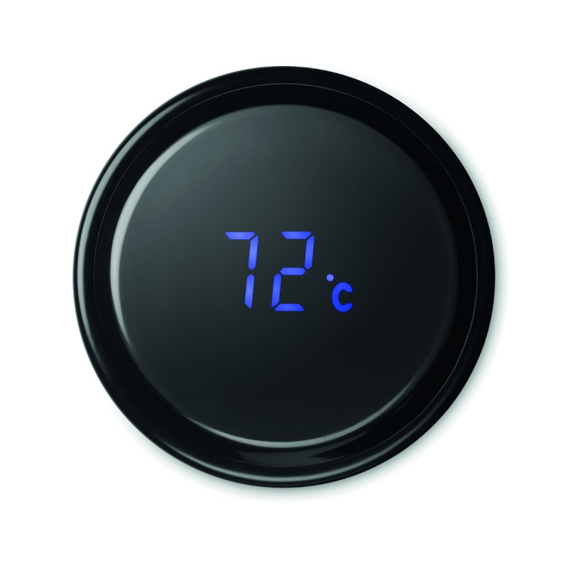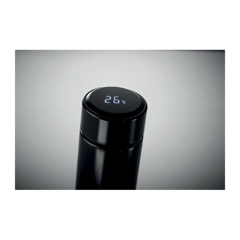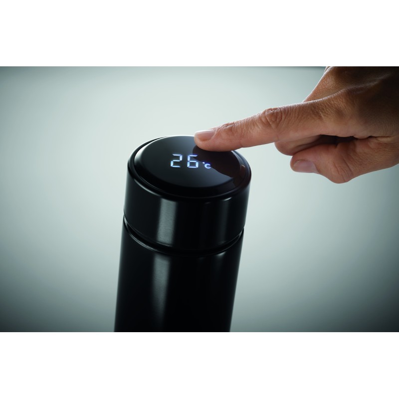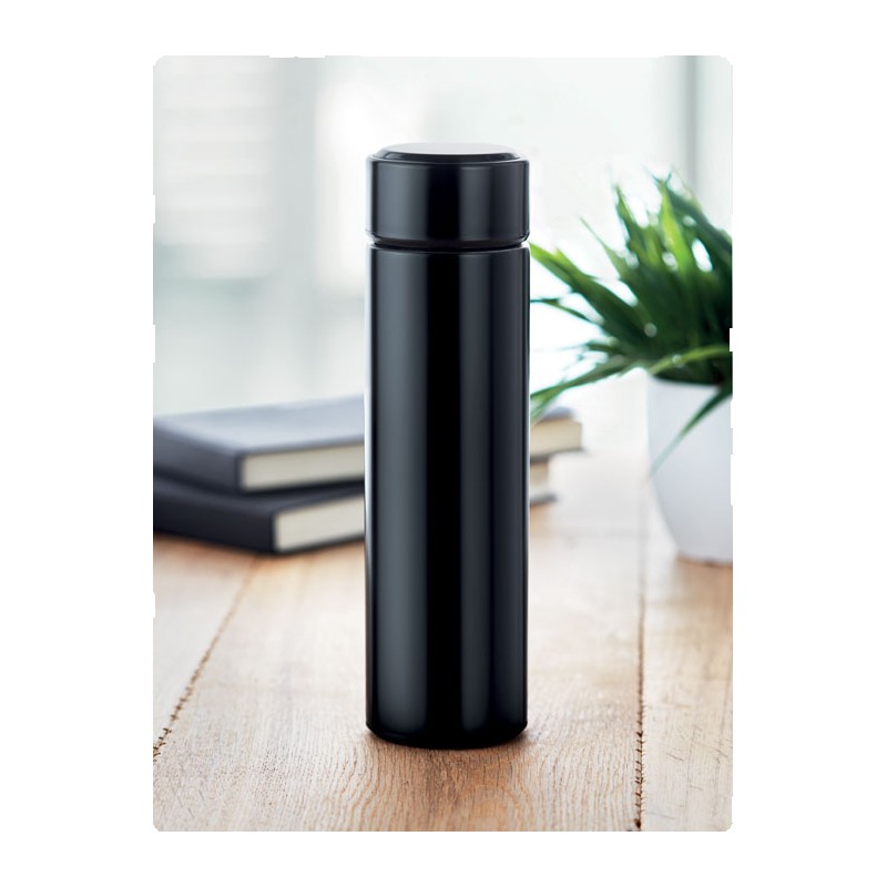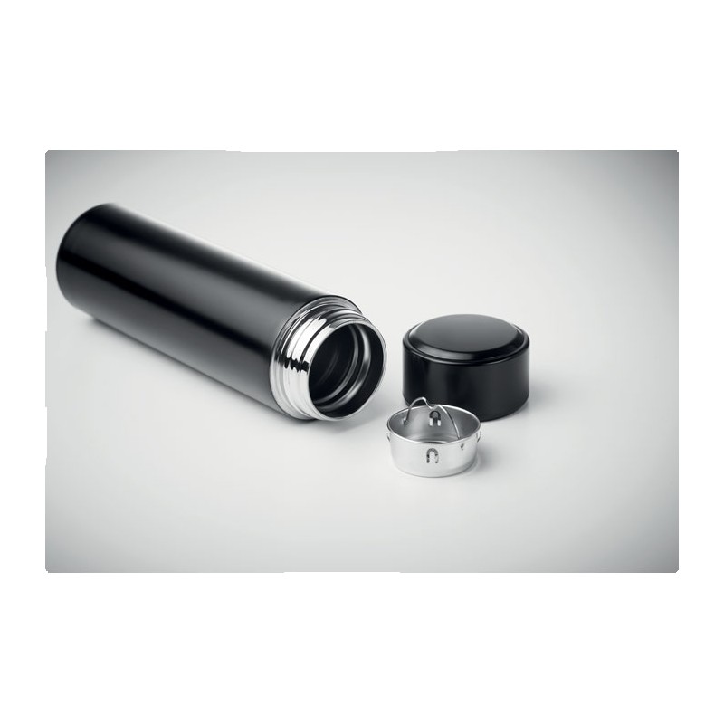 Bouteille à vide isolant en acier inoxydable à double paroi. Comprenant un thermomètre à LED tactile sur le couvercle et un infuseur à thé à l'intérieur. 1 pile CR2032. Étanche. Capacité 450 ml. Anti fuite.