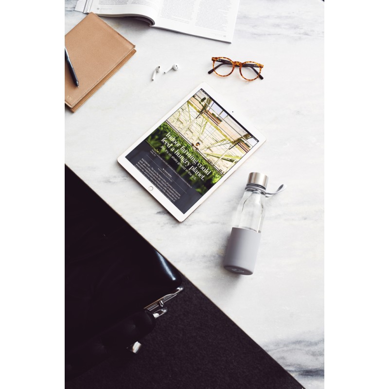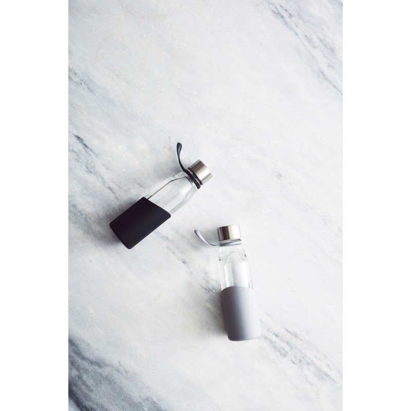 Une bouteille d'eau en verre avec un manchon en silicone. Le manchon offre une bonne prise en main et protège la bouteille des chocs extérieurs. Un design simple et élégant. La bouteille est fabriquée en verre borosilicaté, un type de verre plus résistant aux chocs thermiques que le verre ordinaire. Le borosilicate est un matériau très durable et de qualité qui résiste à la plupart des chocs.