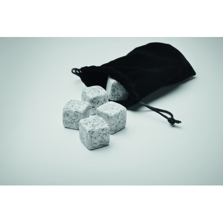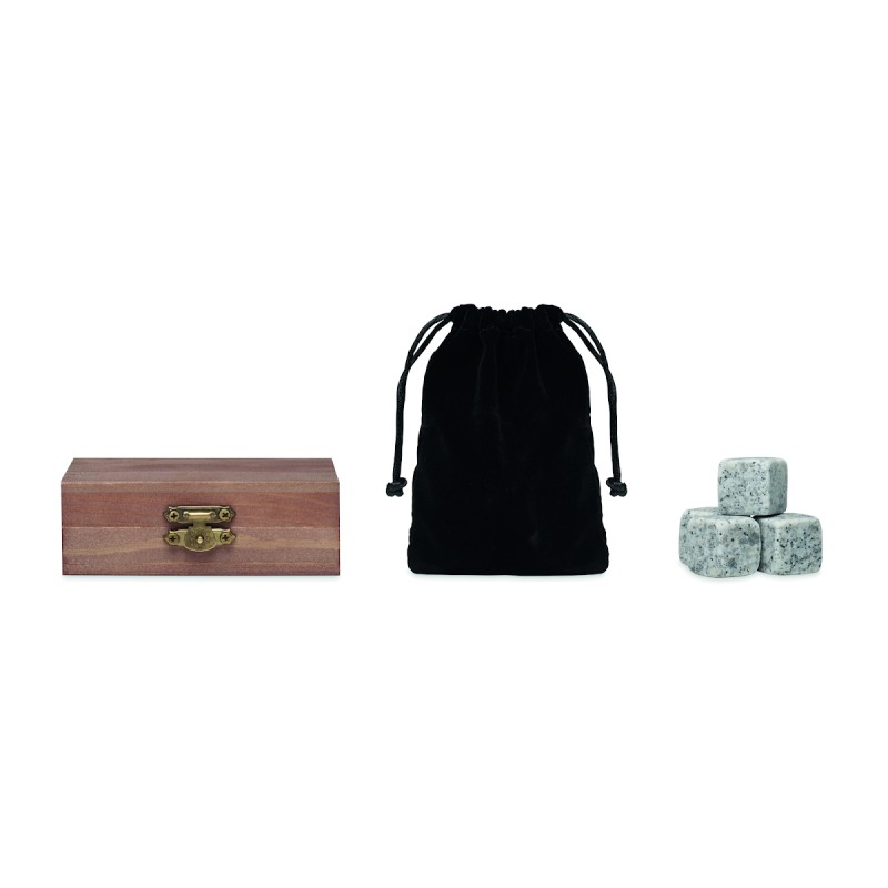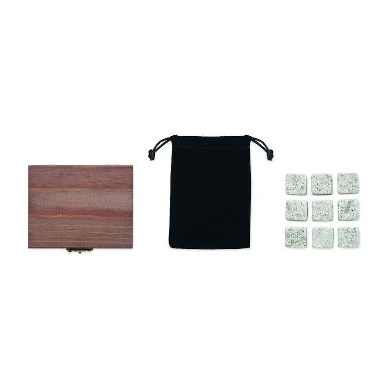 Ensemble de pierres réutilisables dans une boîte en bois de pin. Comprend 9 pierres à glaçons avec pochette en velours.